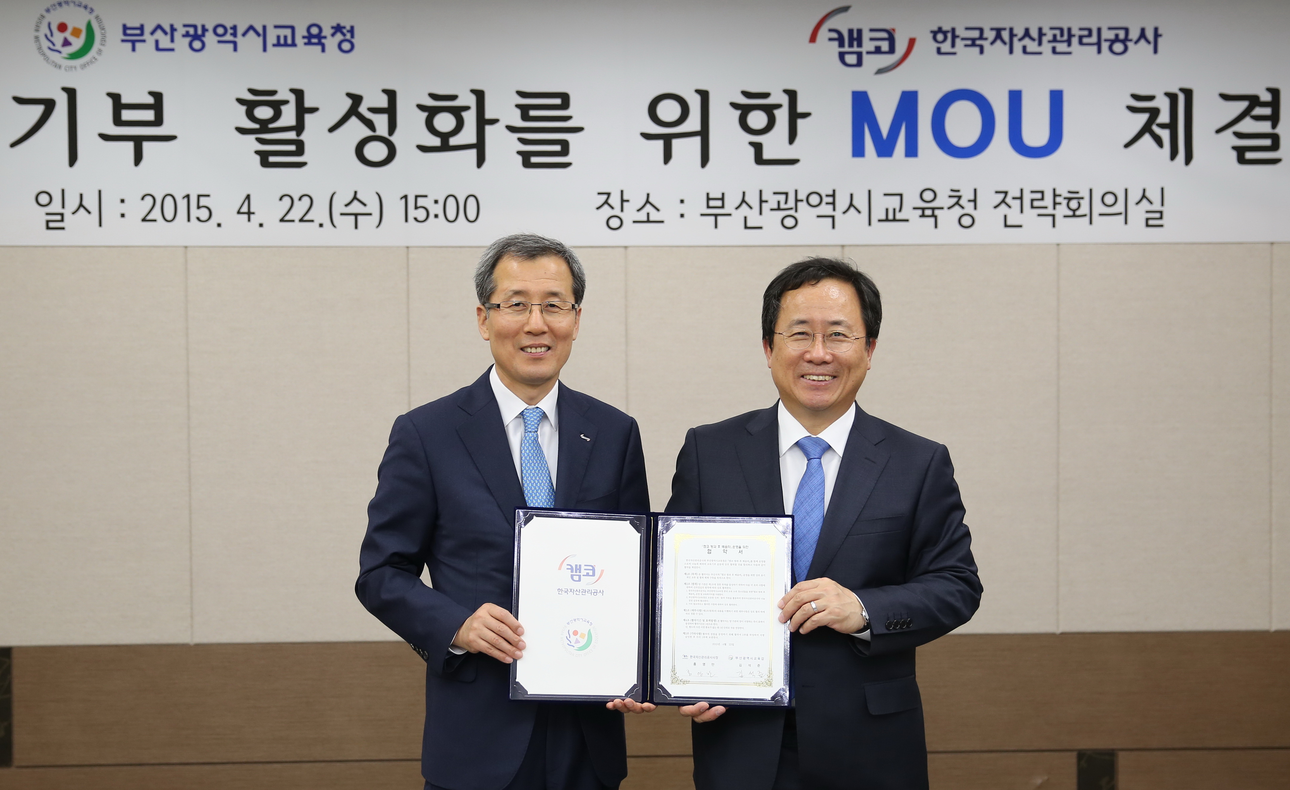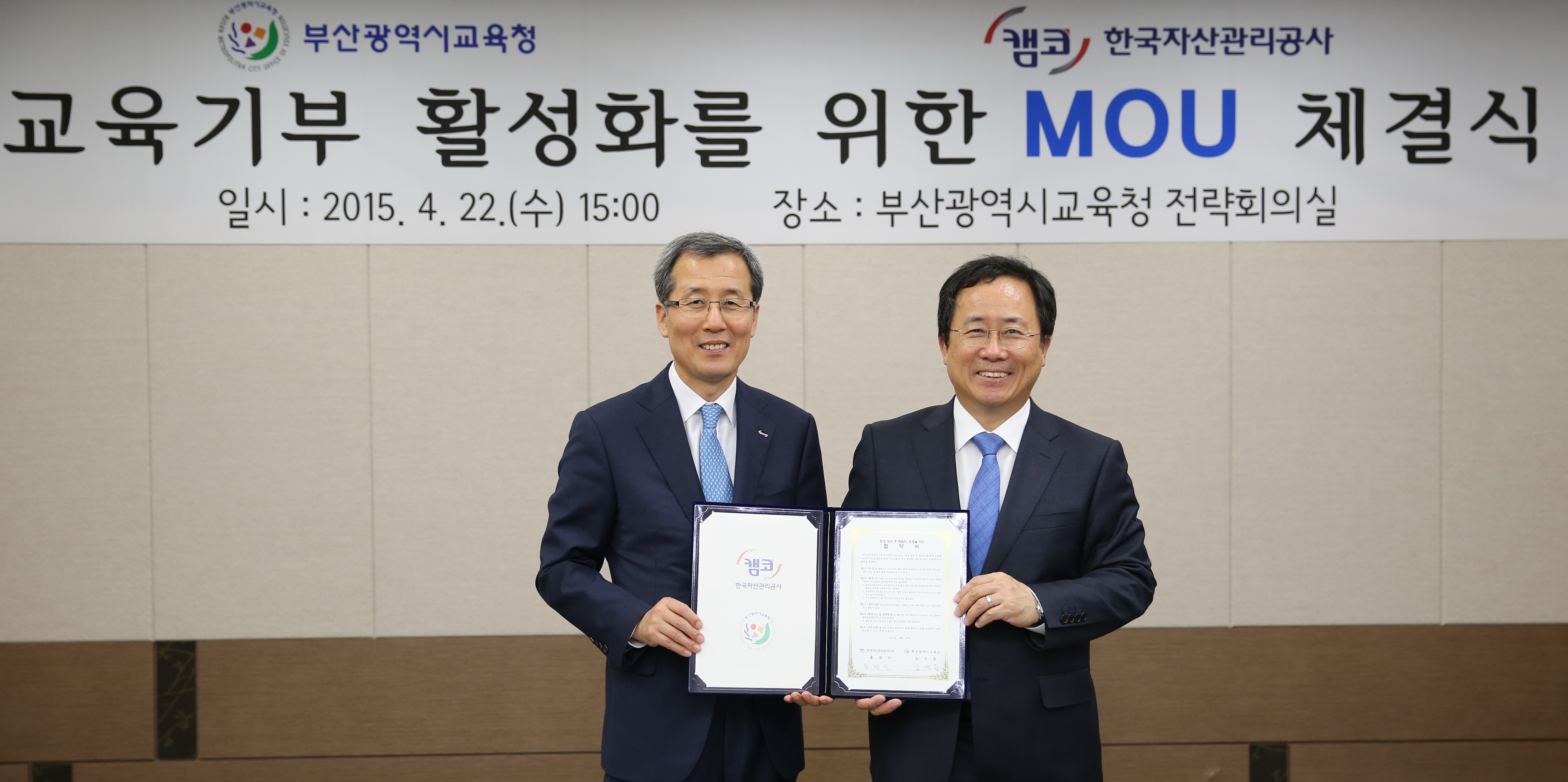 캠코(한국자산관리공사)는 4월 22일(수) 오후 3시 부산시교육청 회의실(부산진구 양정동 소재)에서 부산광역시교육청(교육감 김석준)과 교육격차 해소를 위한 「교육기부 업무협약」을 체결했습니다. 이번 협약을 통해 ‘캠코 방과 후 배움터’를 부산에 확대 실시하고, 직원 재능기부와 1억2천만원의 교육복지 프로그램 운영비 및 장학금을 지원할 예정입니다.