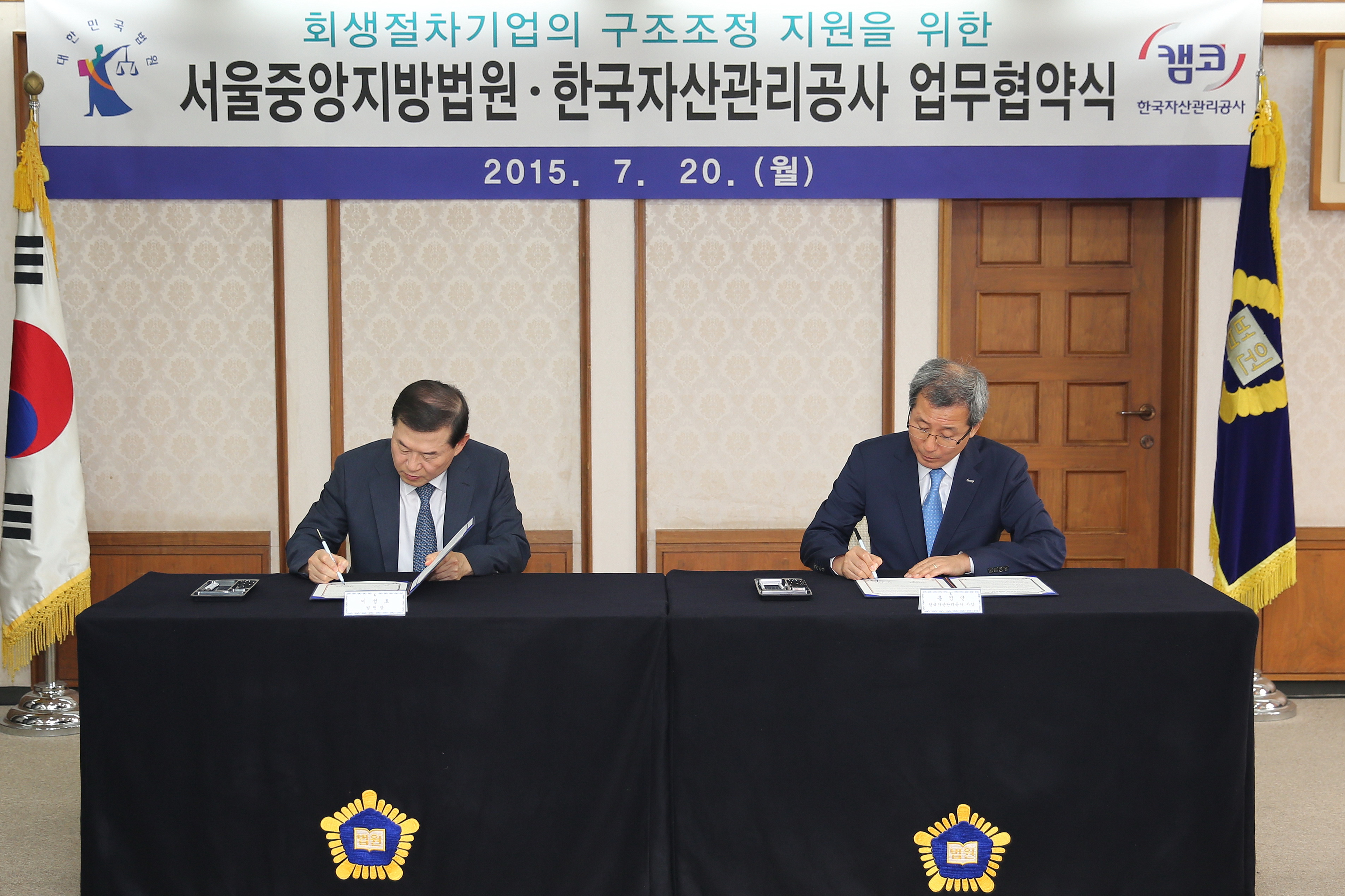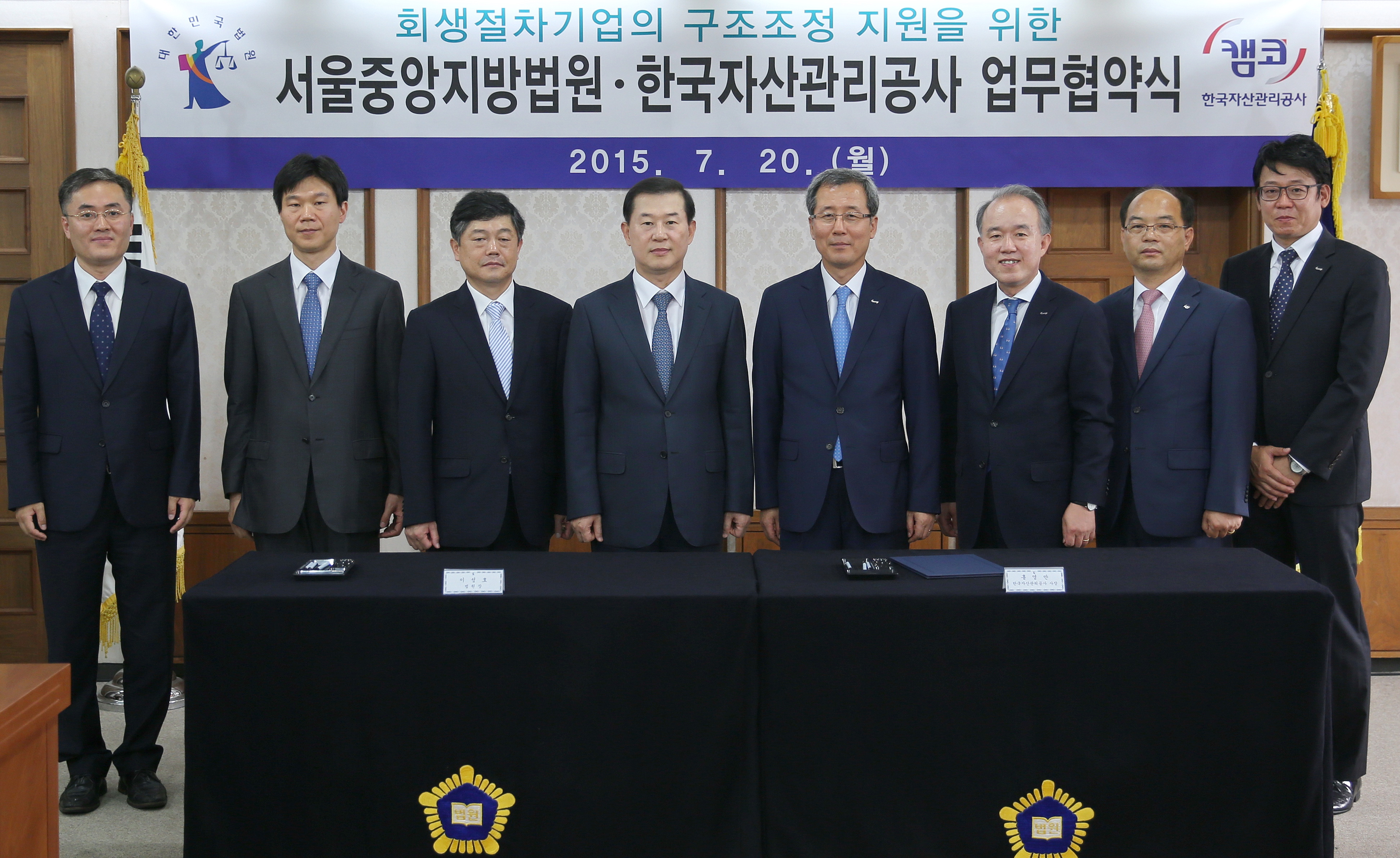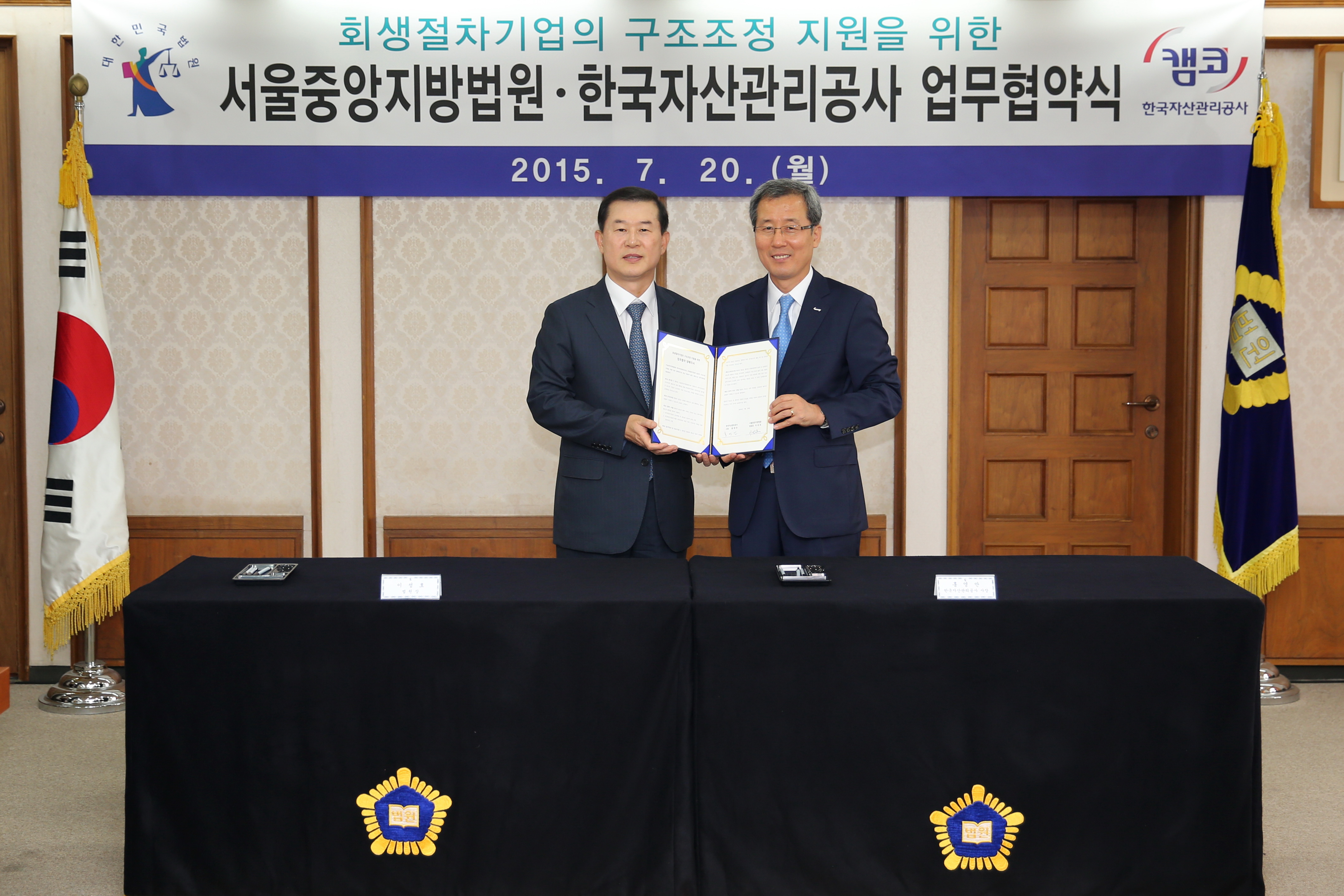 캠코(한국자산관리공사)는 7월 20일(월) 오전 10시 서울법원종합청사 동관 14층 회의실에서 서울중앙지방법원과「회생절차기업의 효율적 구조조정 지원을 위한 업무협약(MOU)」을 체결하였습니다. 이번 협약으로 캠코와 법원은 회생절차 중소기업의 구조조정 지원을 위한 포괄적 협력 체제를 갖추게 됩니다.