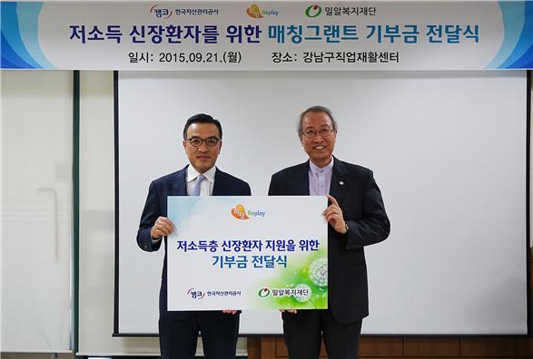 캠코(한국자산관리공사)는 9월 21일(월) 오후 3시 밀알복지재단 강남구직업재활센터(서울 강남구 수서동 소재)에서 저소득 신장환자의 수술 및 자활지원을 위해 사회복지법인 밀알복지재단(이사장 홍정길)에 기부금 3억 5천만원을 전달했습니다. 이 기부금은 임직원들의 기부금과 회사의 지원금을 1:1로 매칭하여 조성된 매칭그랜트 방식 기금을 통해 마련되었습니다.