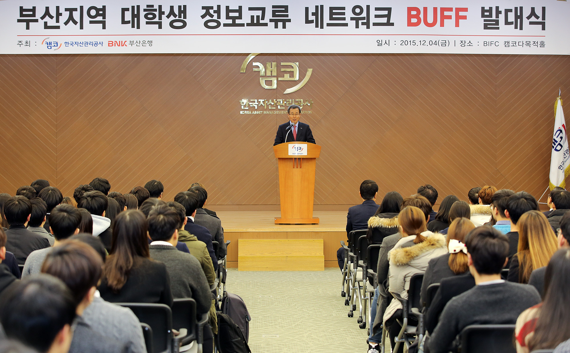 캠코(한국자산관리공사, 사장 홍영만)와 BNK 금융그룹(회장 성세환) 부산은행은 4일(금) 오후 3시 부산국제금융센터에서 ‘대학생 정보교류 네트워크 BUFF*’ 발대식을 개최했습니다. . BUFF는 캠코와 BNK부산은행이 금융·경제 지식 및 인적역량을 활용하여 기업이 필요로 하는 지역인재 양성을 지원하는 광의의 산학협력 프로젝트입니다.
