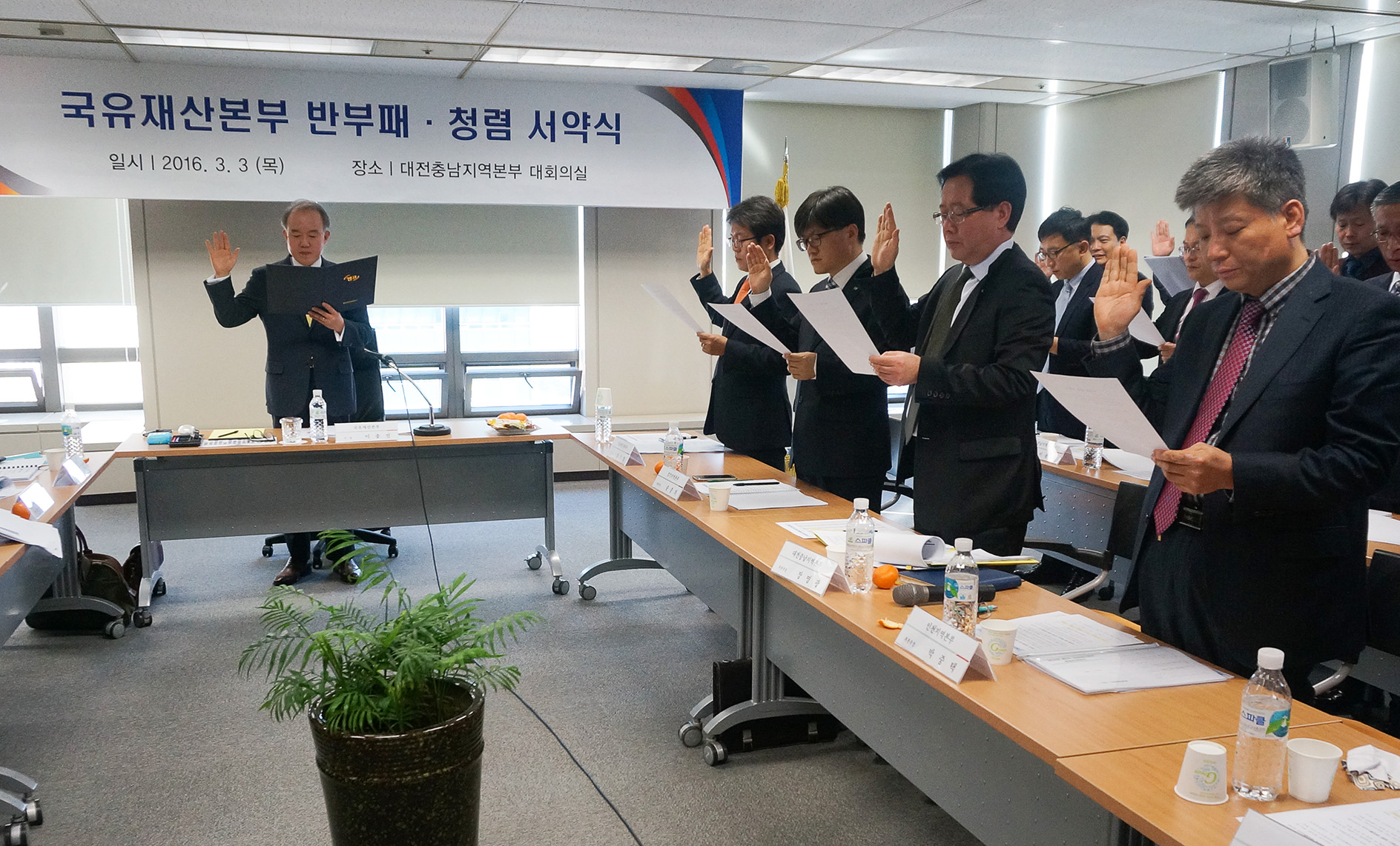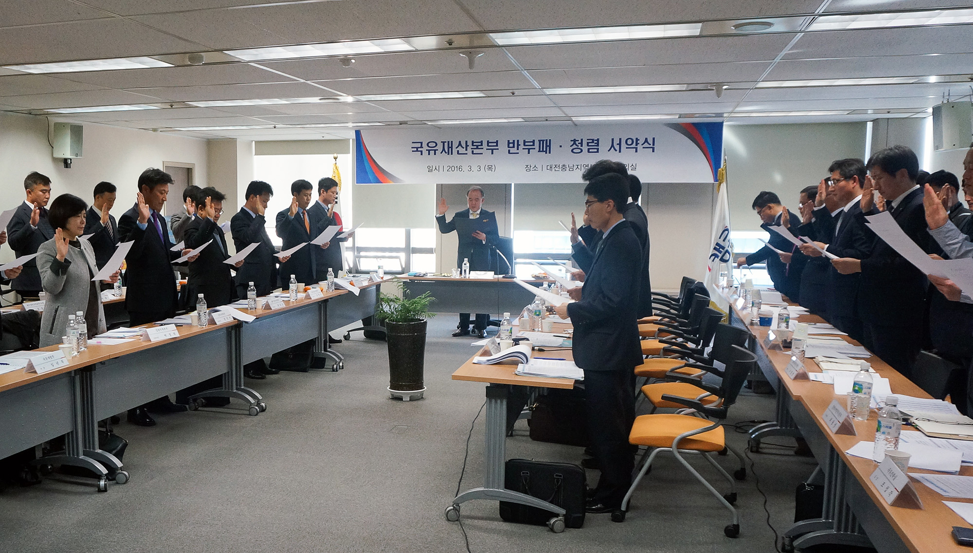 캠코(한국자산관리공사, 사장 홍영만)는 3월 3일(목) 캠코 대전충남지역본부에서 국유재산본부 이종진 이사를 포함한 주요 실무자 30여명이 모인 가운데 「국유재산 반부패·청렴 서약식」을 실시했습니다.