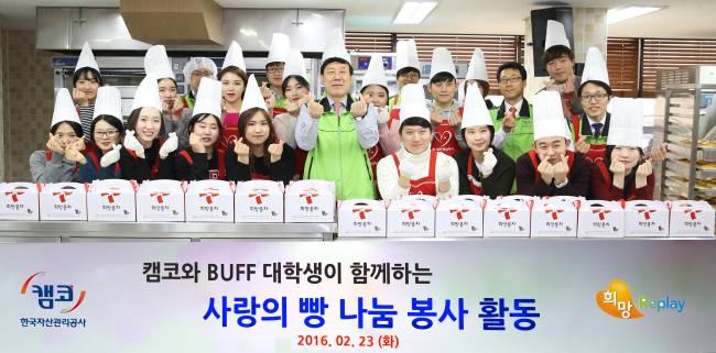 캠코(한국자산관리공사, 사장 홍영만)는 2월 23일(화) 대한적십자사 부산지사 희망나눔봉사센터에서 캠코 임직원 및 부산지역 대학생 총 30명과 ‘사랑의 빵 나눔’ 활동을 펼쳤습니다.
