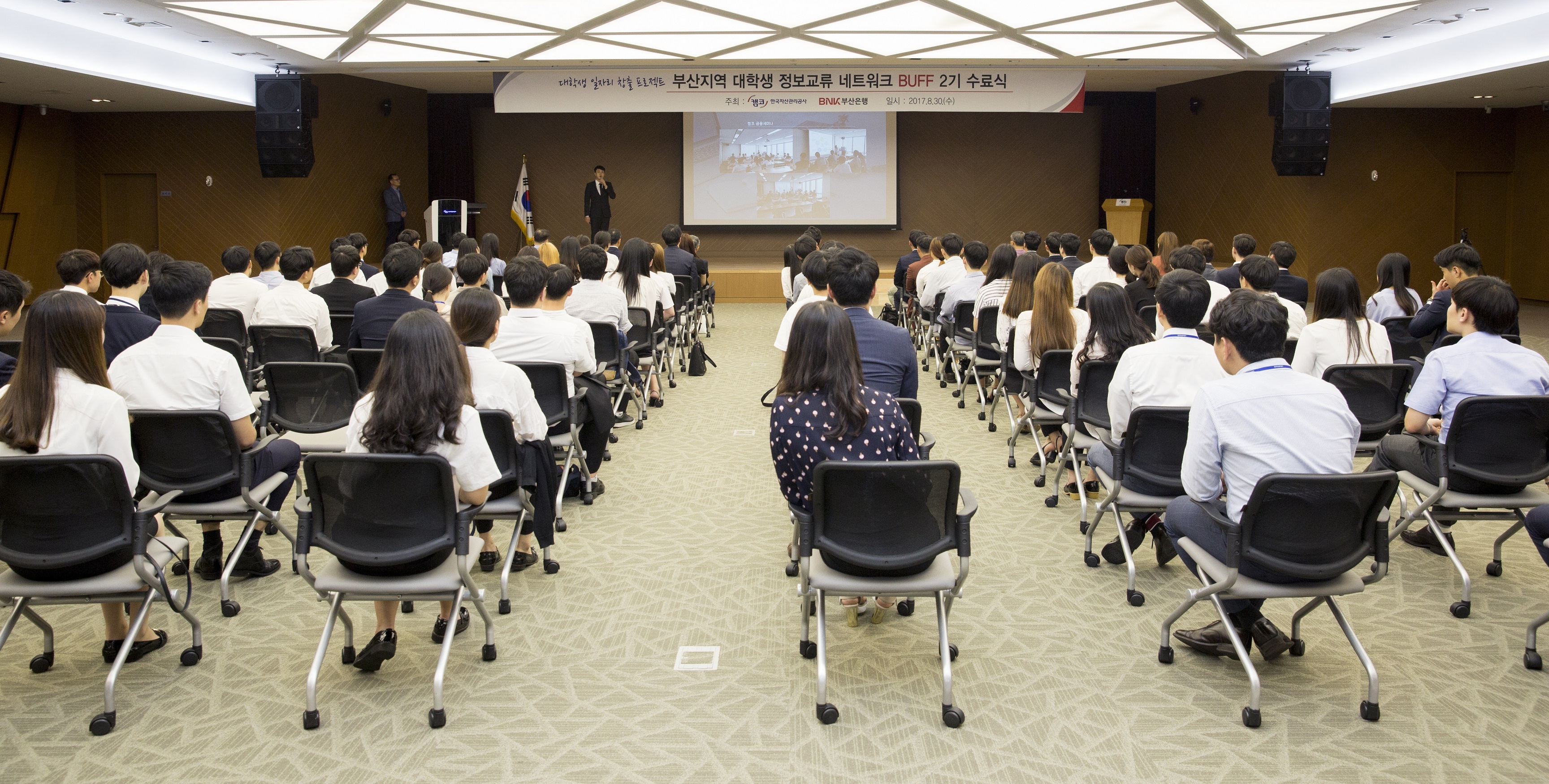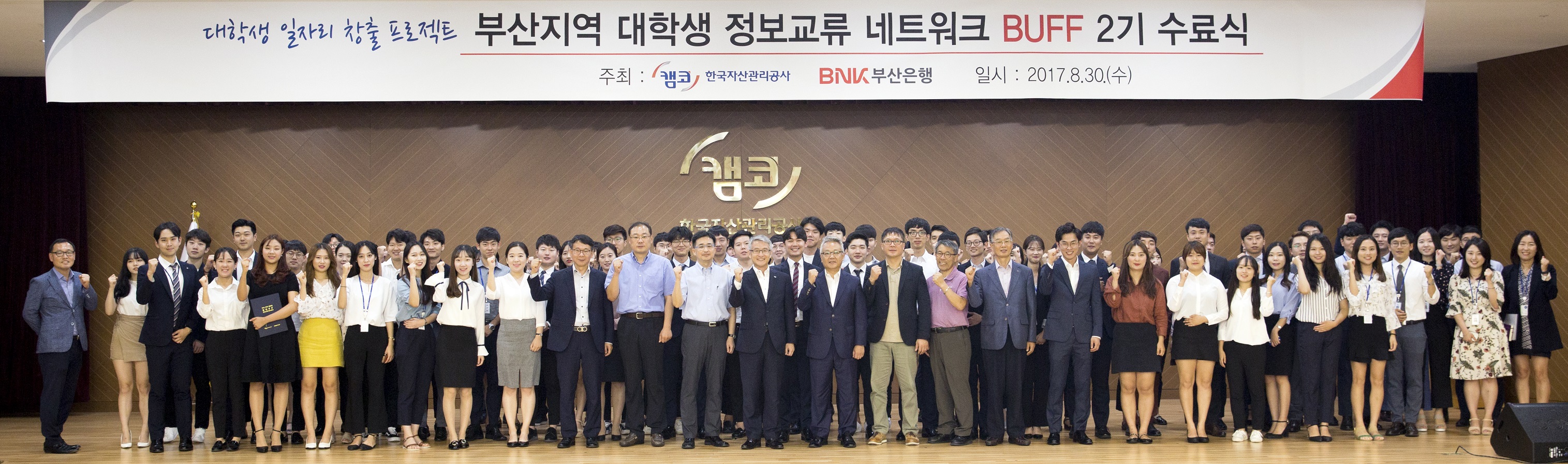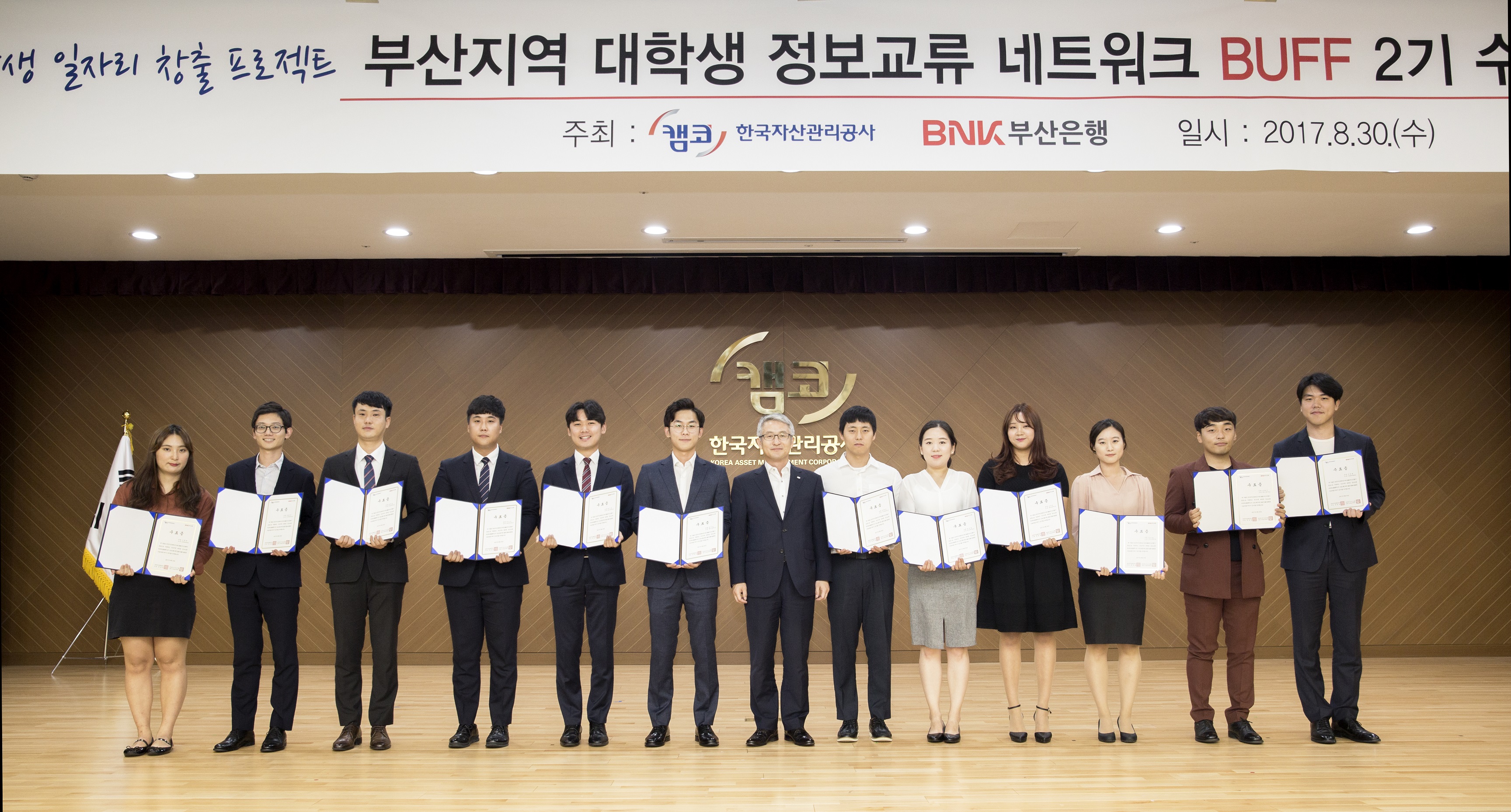 캠코(한국자산관리공사, 사장 문창용)는 8월 30일(수) 14시 본사(부산 문현동 소재) 3층 캠코마루에서 문창용 캠코 사장을 비롯한 BUFF 2기 100명의 학생 및 각 대학 지도교수, 캠코와 BNK부산은행 관계자 등 총 120여명이 참석한 가운데 ‘부산지역 대학생 정보교류 네트워크 BUFF’ 2기 수료식을 개최하였습니다.
