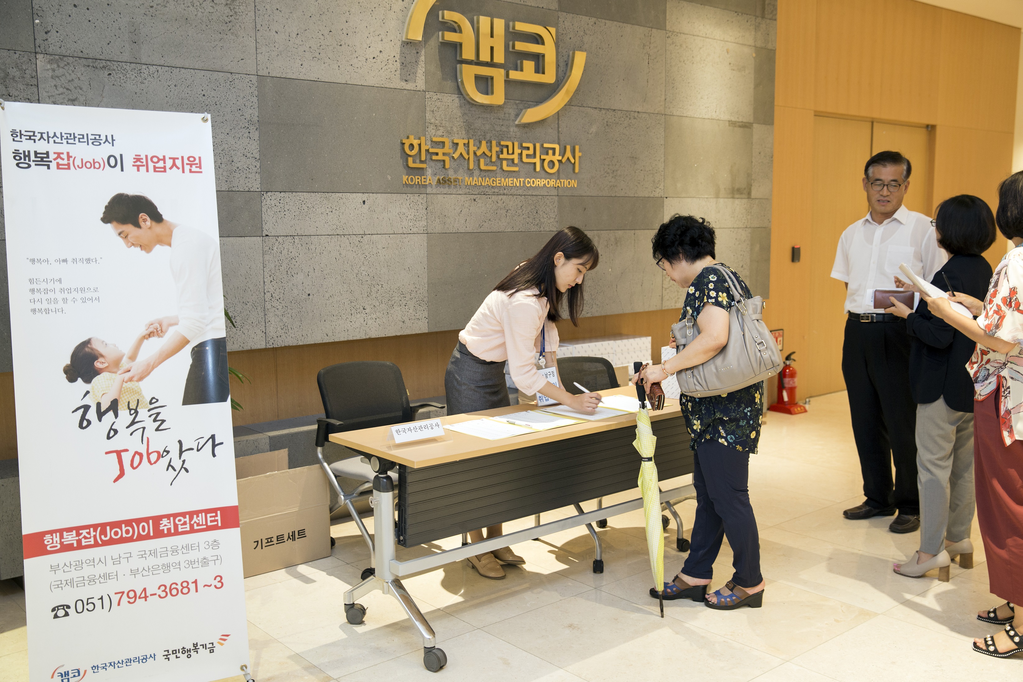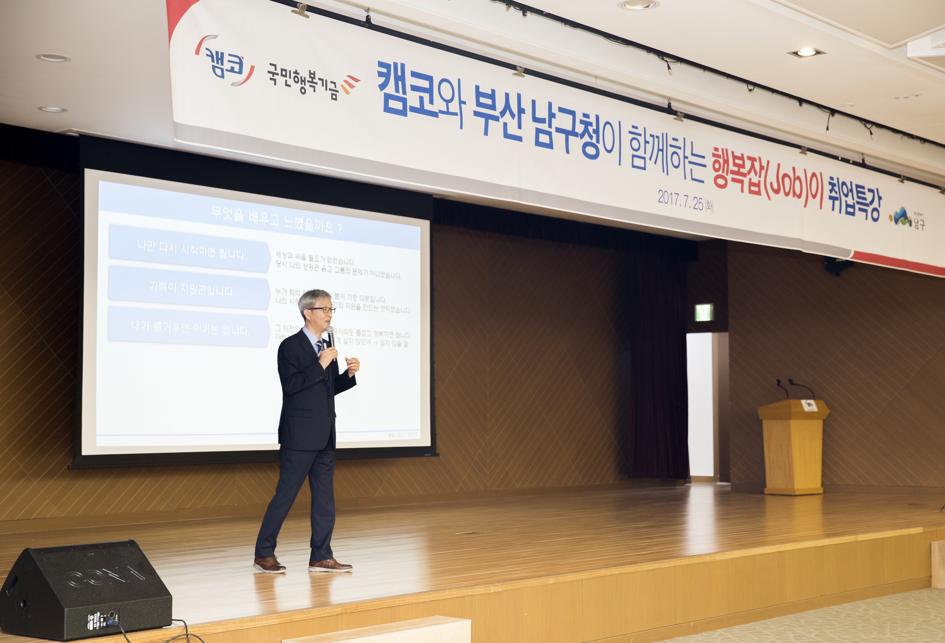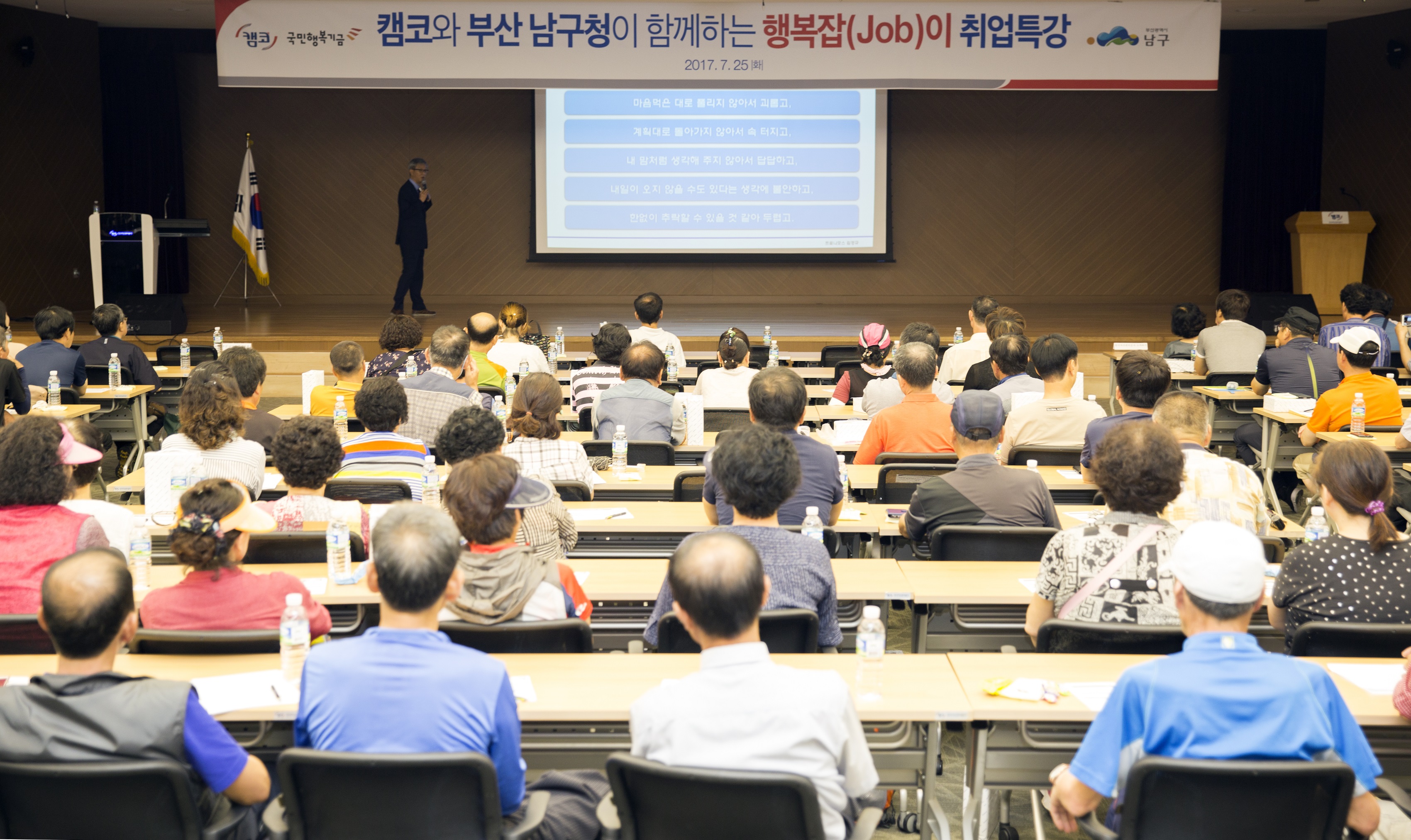 캠코(한국자산관리공사, 사장 문창용)는 7월 25일(화) 오후 2시부터 4시까지 본사(BIFC, 부산 문현동 소재) 3층 캠코마루에서 국민행복기금 신용회복지원 고객과 부산 남구 지역서민 등 재취업을 희망하는 중ㆍ장년층 약 170명을 대상으로 ‘행복잡(Job)이 취업 특강’을 개최하였습니다.