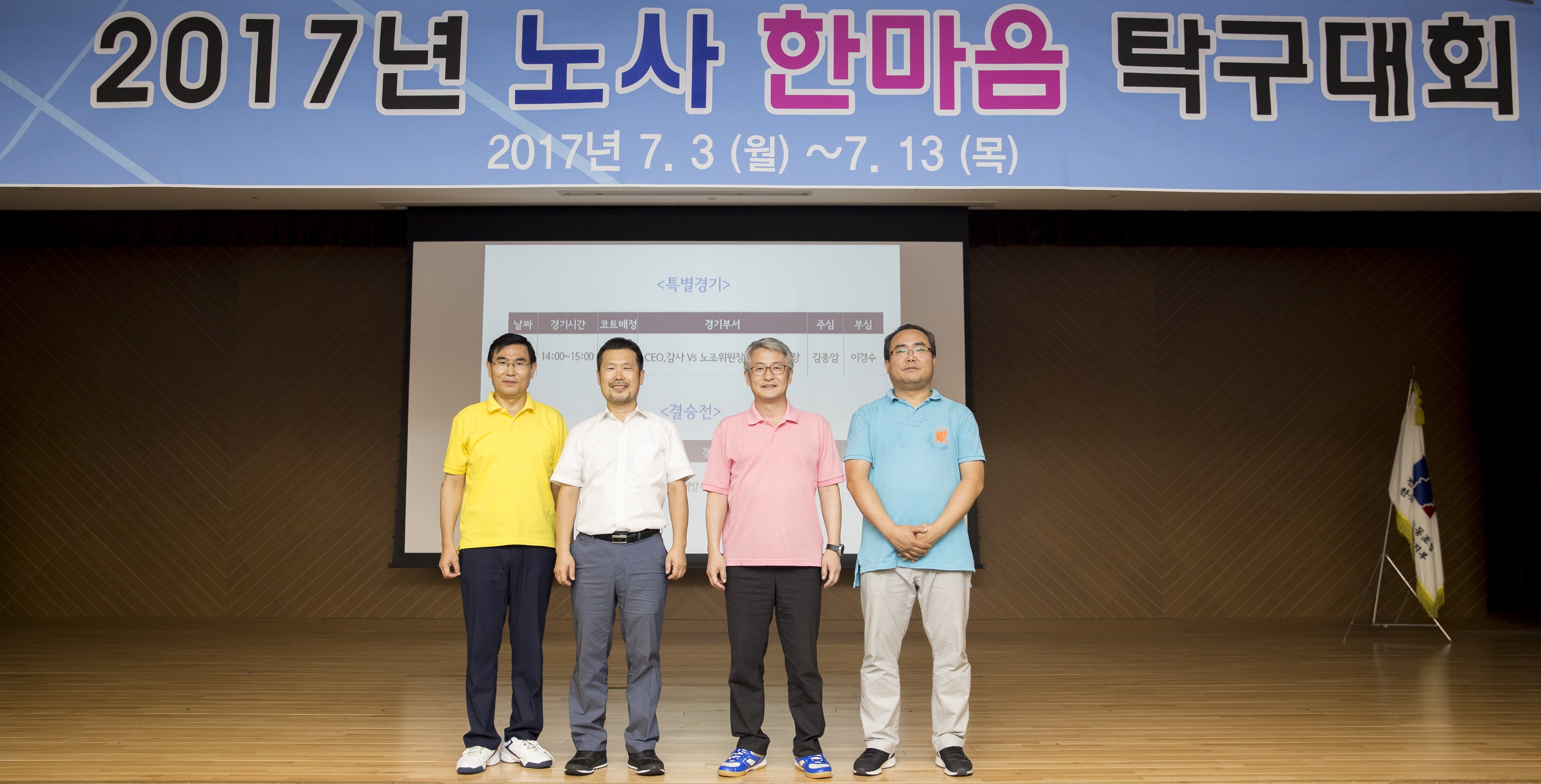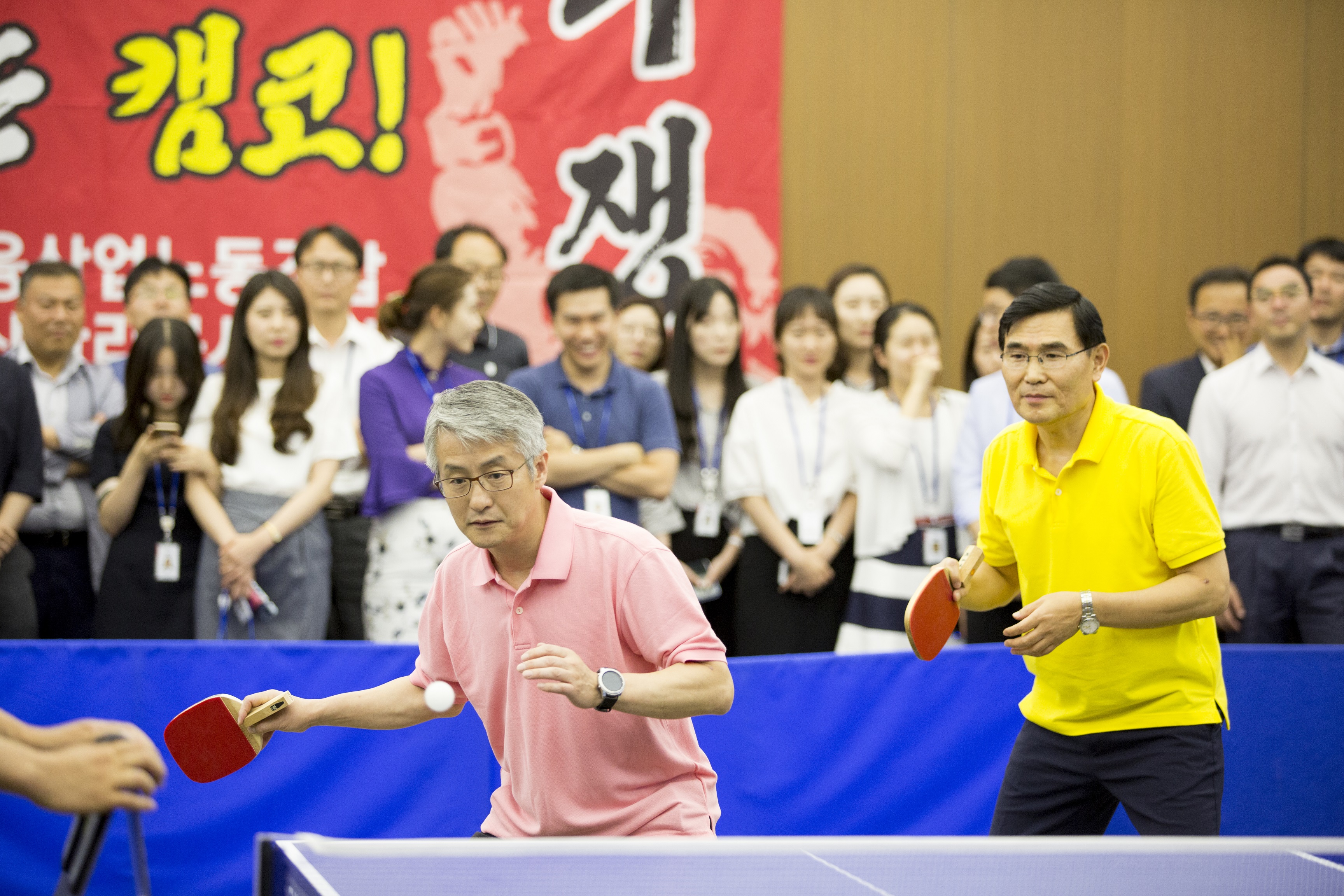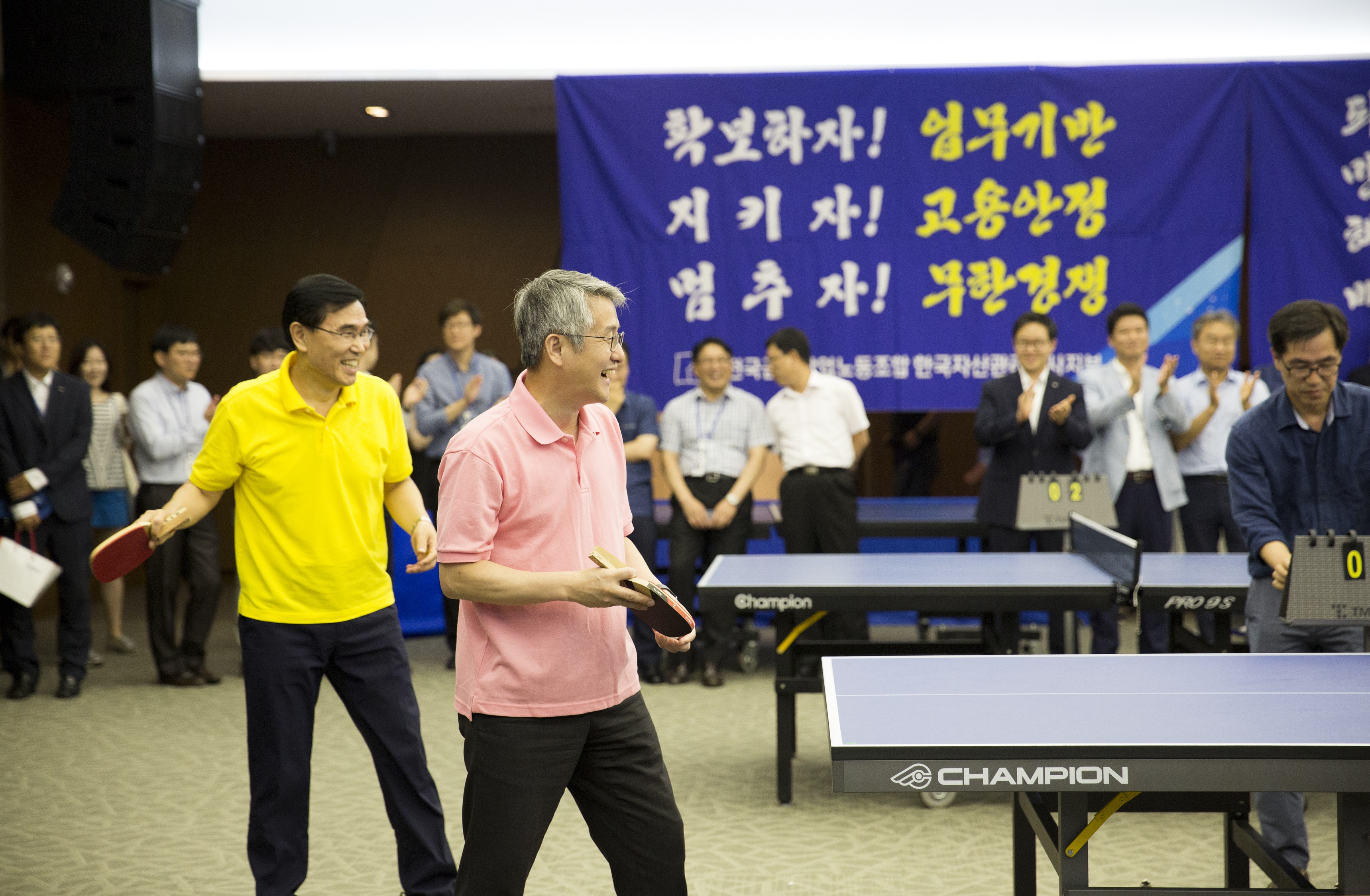 캠코(한국자산관리공사, 사장 문창용)는 7월 13일(목) 오후 2시 본사(BIFC, 부산 문현동 소재) 3층 캠코마루에서 노동조합 창립 30주년을 기념하여 노사대표 및 임직원이 참석한 가운데 「2017년 노사 한마음 탁구대회」 행사를 가졌습니다.