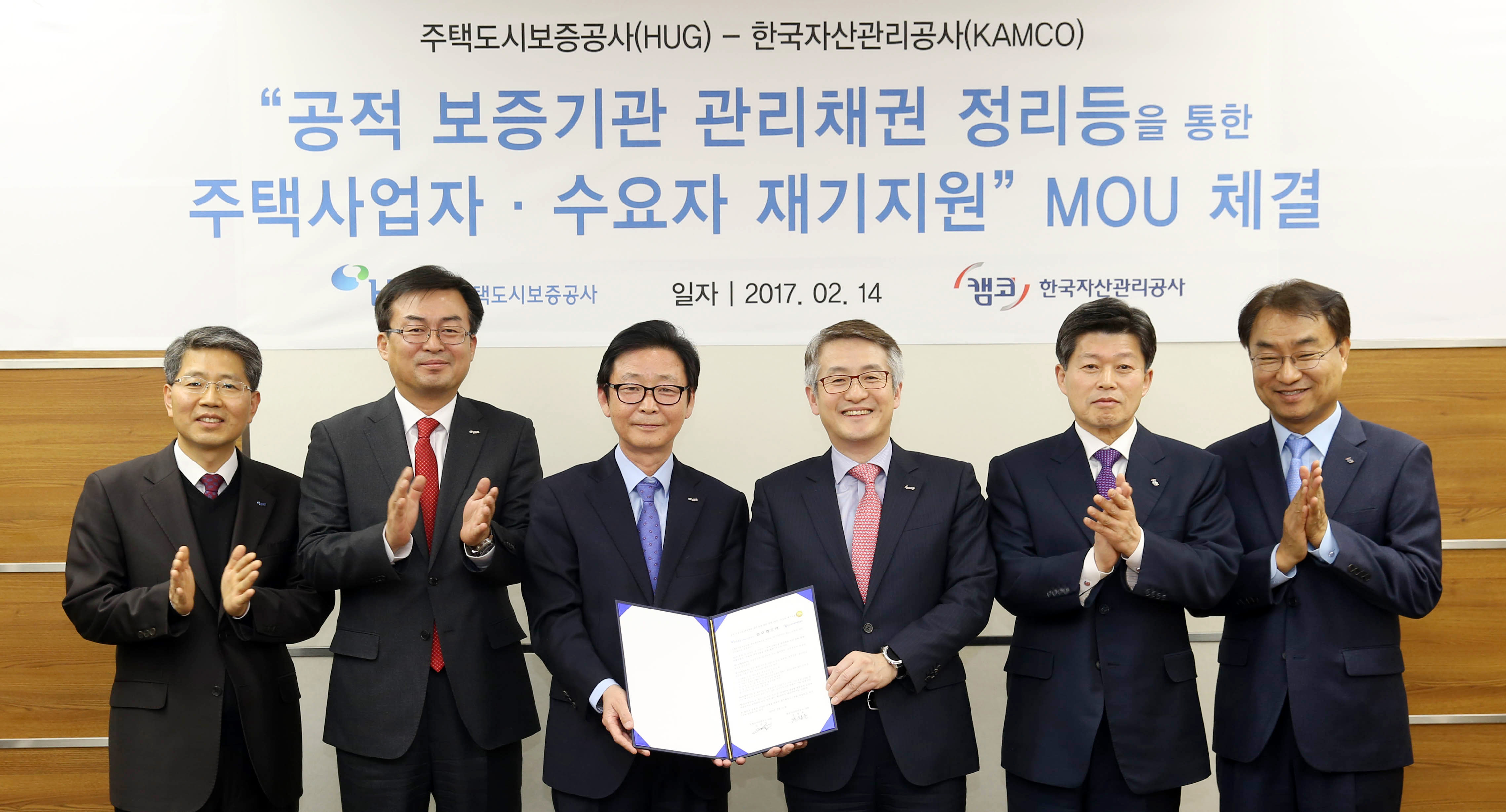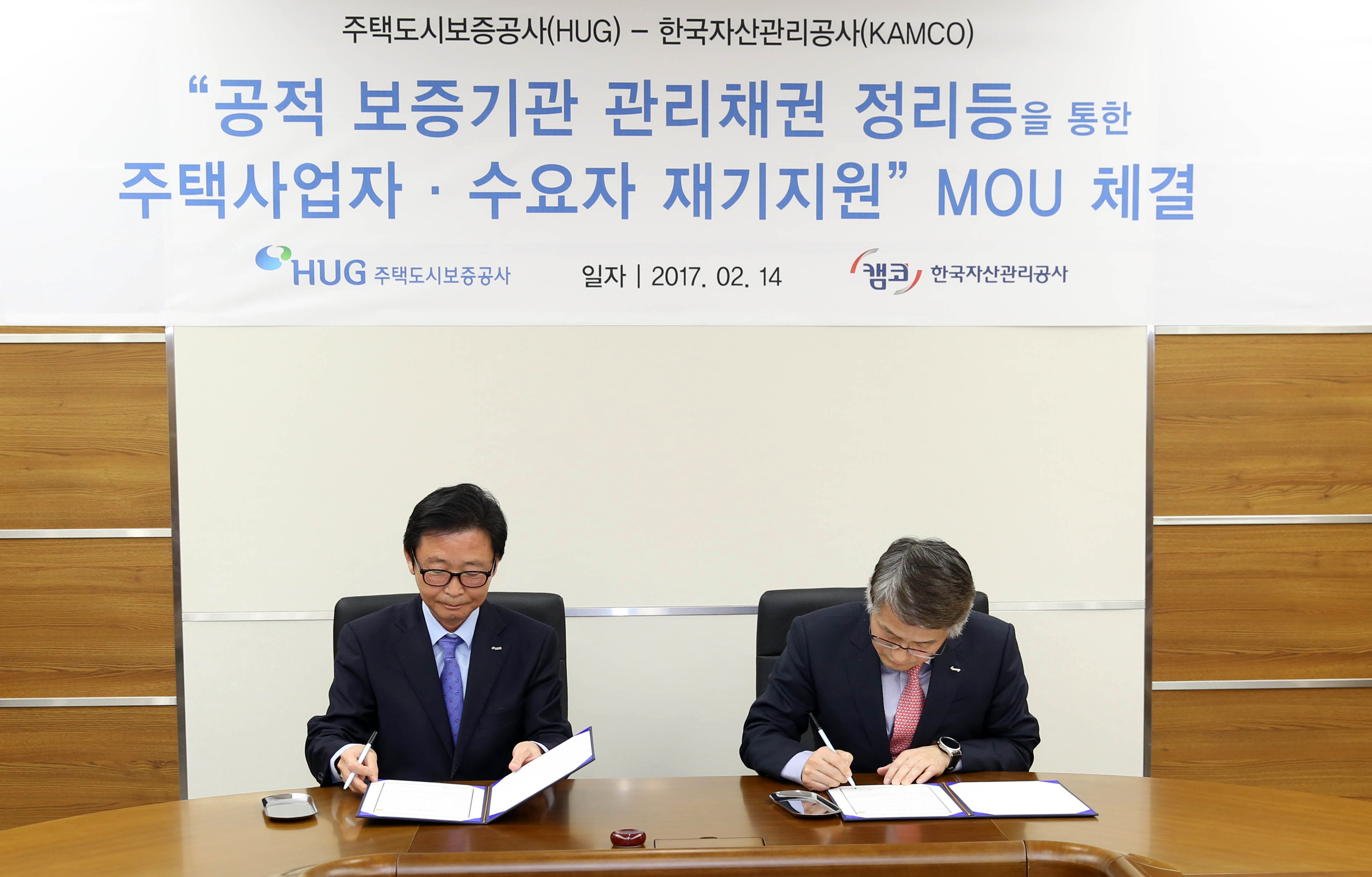 캠코(한국자산관리공사, 사장 문창용)와 HUG(주택도시보증공사, 사장 김선덕)는 2월 14일(화) 오후 5시 부산국제금융센터(BIFC) HUG본사에서 ‘공적 보증기관 관리채권 정리 등을 통한 주택사업자․수요자 재기지원’을 위한 업무협약을 체결했습니다.