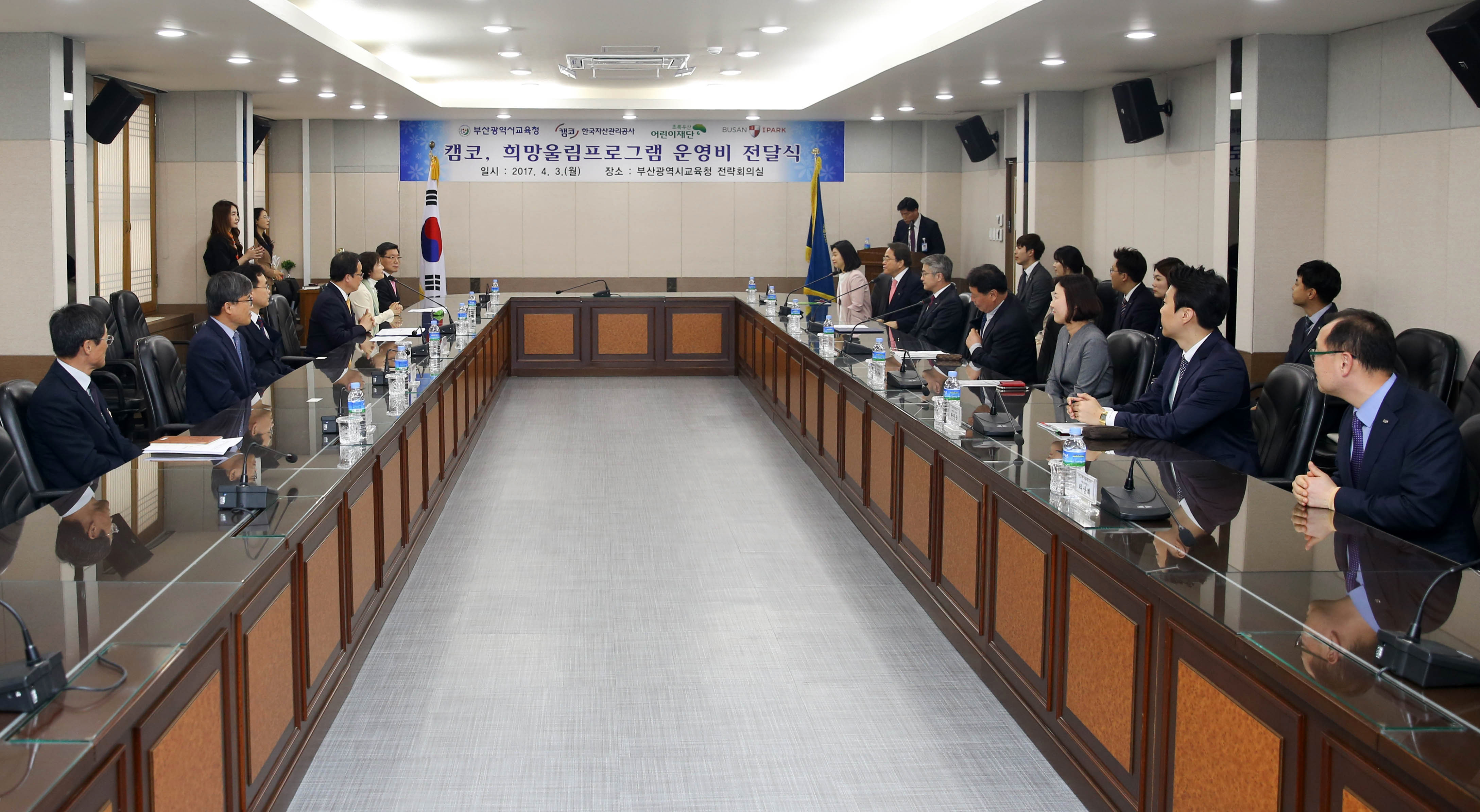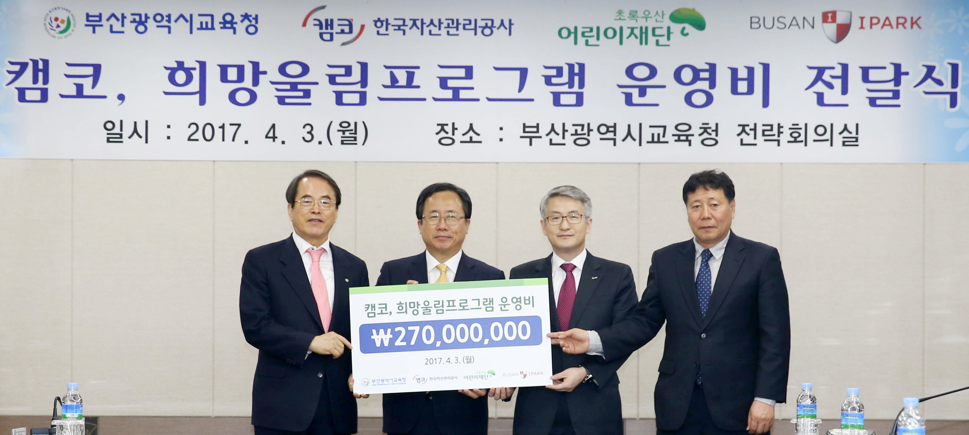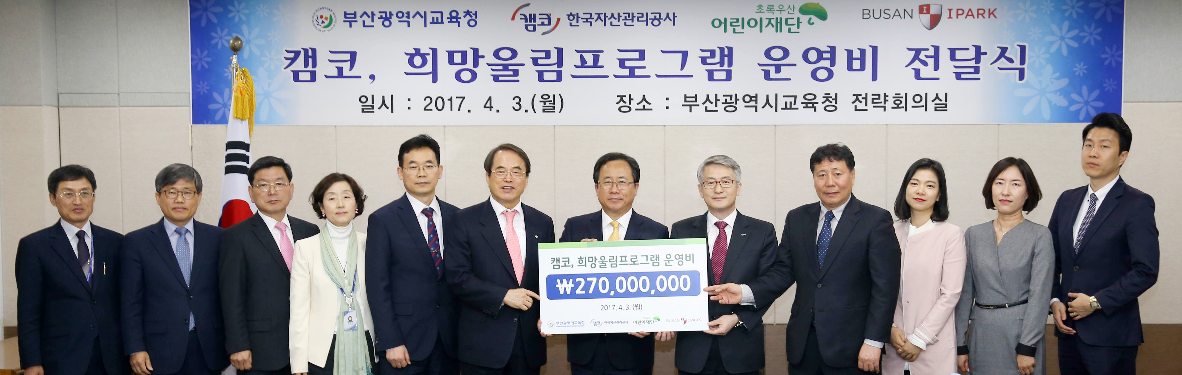 캠코는 4월 3일(월) 오후 4시 부산시 교육청 회의실(부산시 부산진구 양정동 소재)에서 부산광역시 교육청과 초록우산 어린이재단에 희망울림프로그램 운영비 등으로 2억 7천만원을 전달하였습니다.