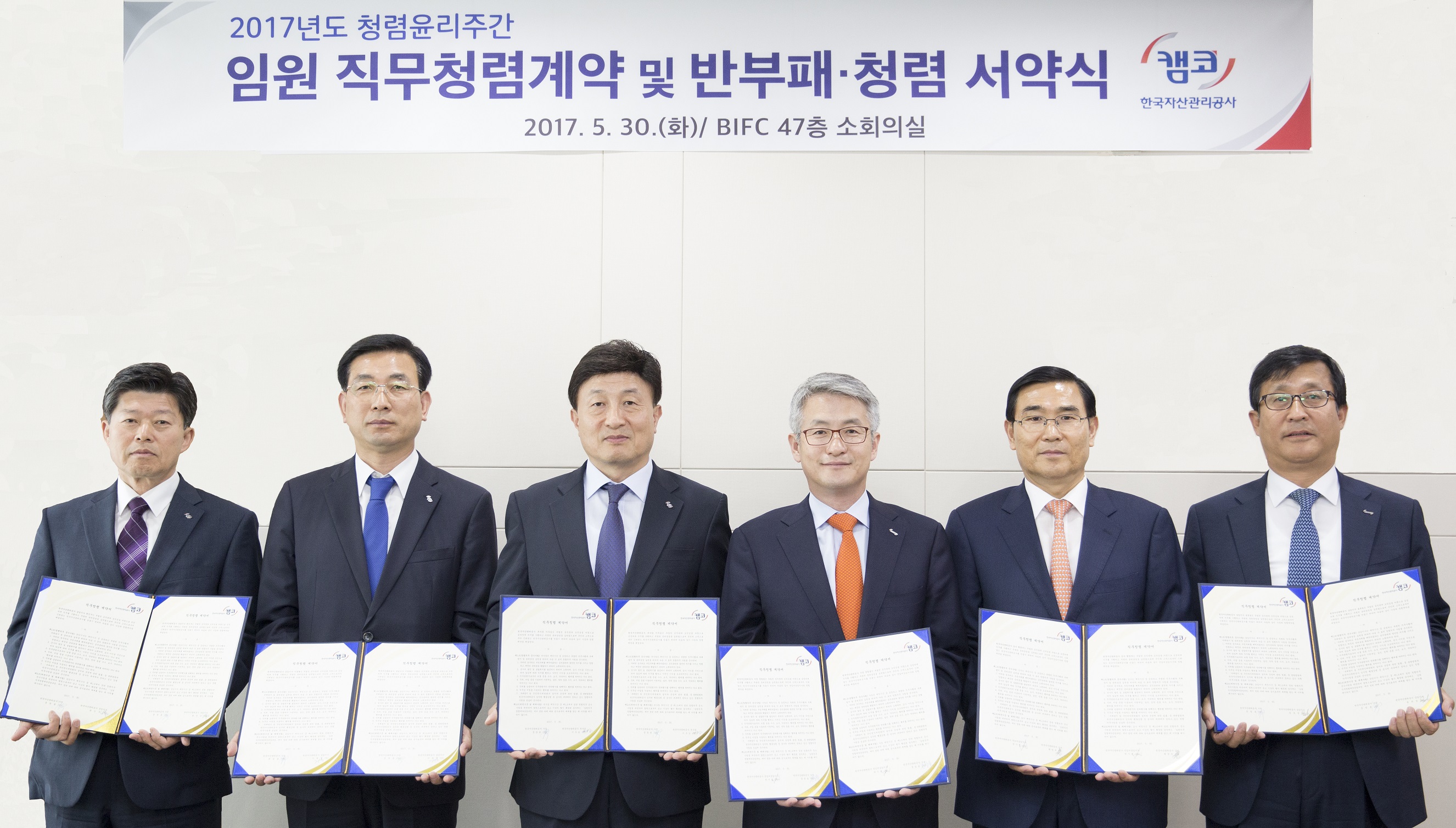 캠코(한국자산관리공사, 사장 문창용)는 5월 30일(화) 오전 10시 부산 본사 BIFC 47층(부산 문현동 소재) 소회의실에서 문창용 사장을 비롯한 모든 임원들이 참석한 가운데 「임원 청렴계약ㆍ서약식」을 개최하였습니다.