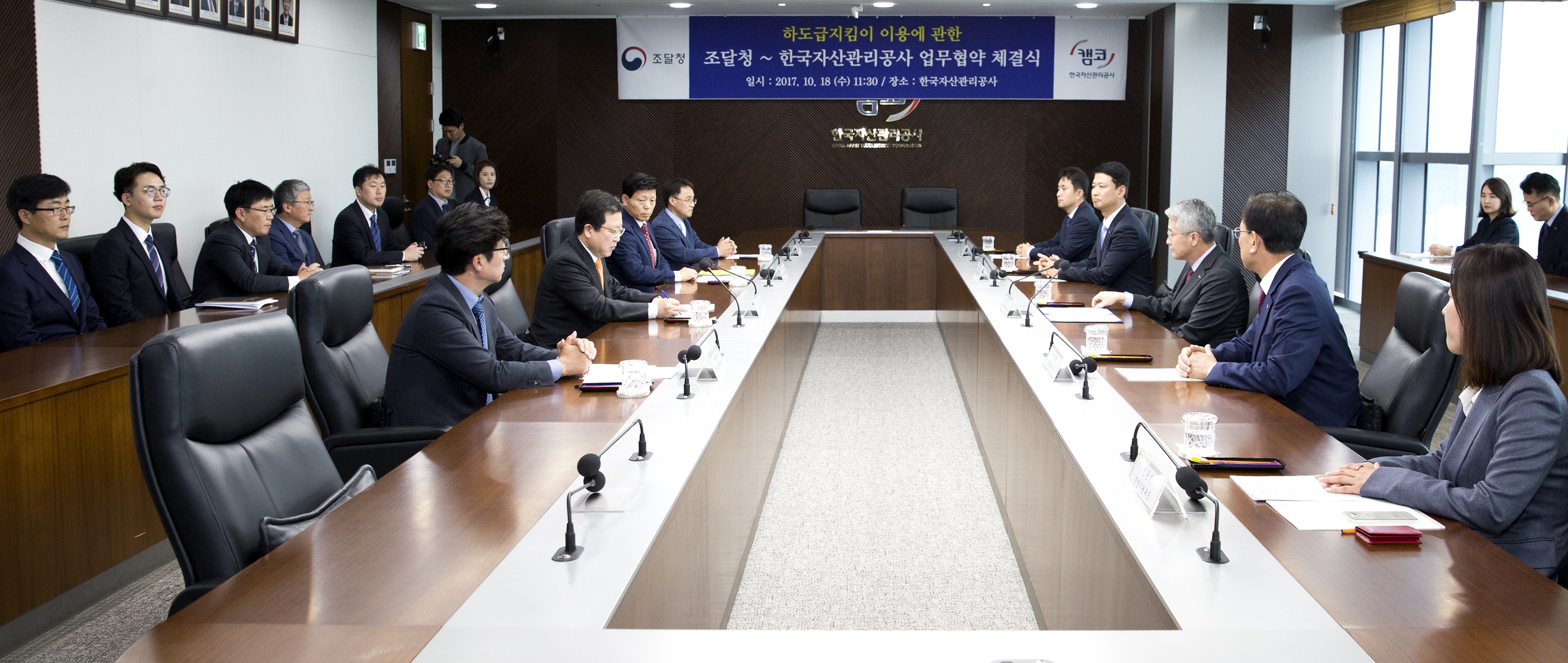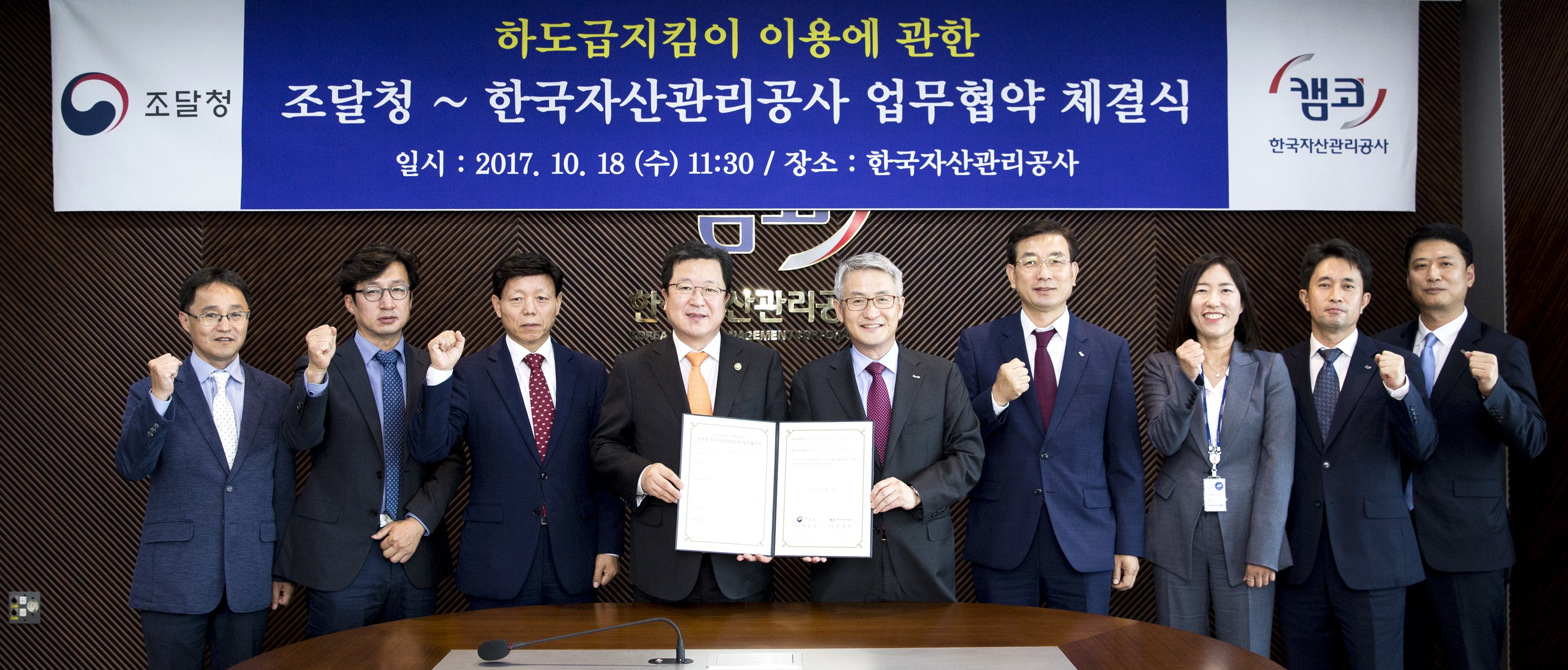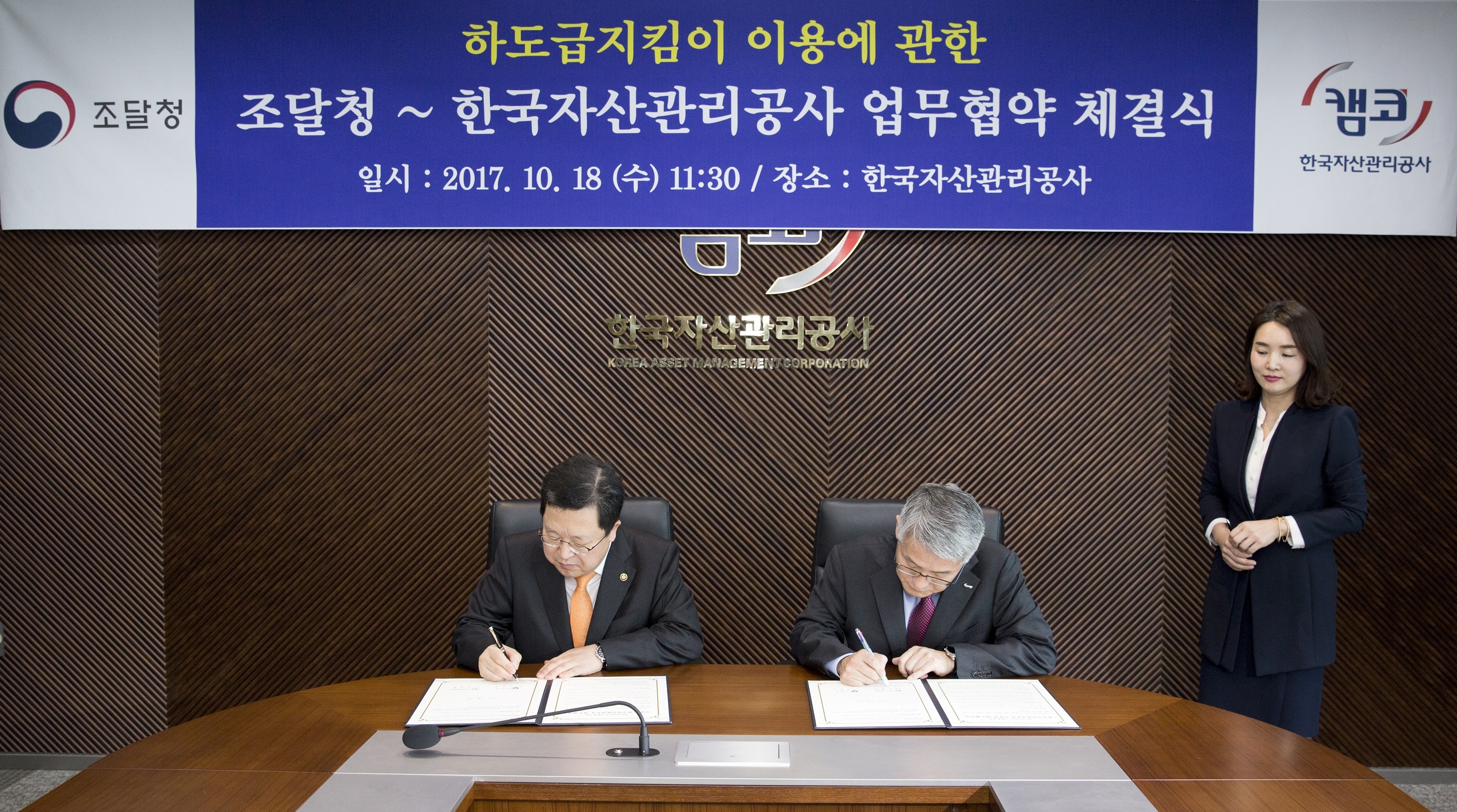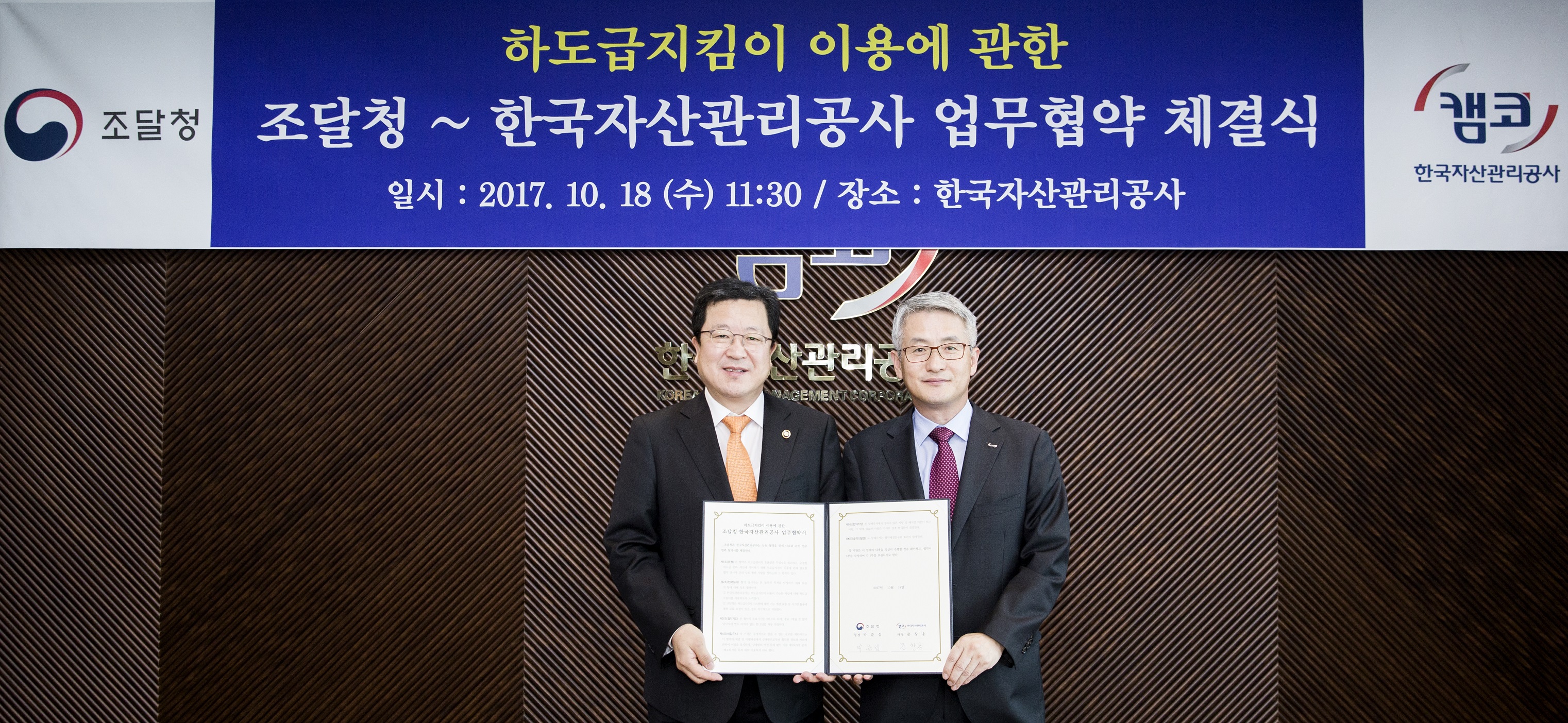 캠코(한국자산관리공사, 사장 문창용)는 조달청(청장 박춘섭)과 10월 18일(수) 11시 30분 캠코 본사(부산 국제금융센터)에서 '하도급지킴이 이용에 관한 업무협약(MOU)' 를 체결했습니다.