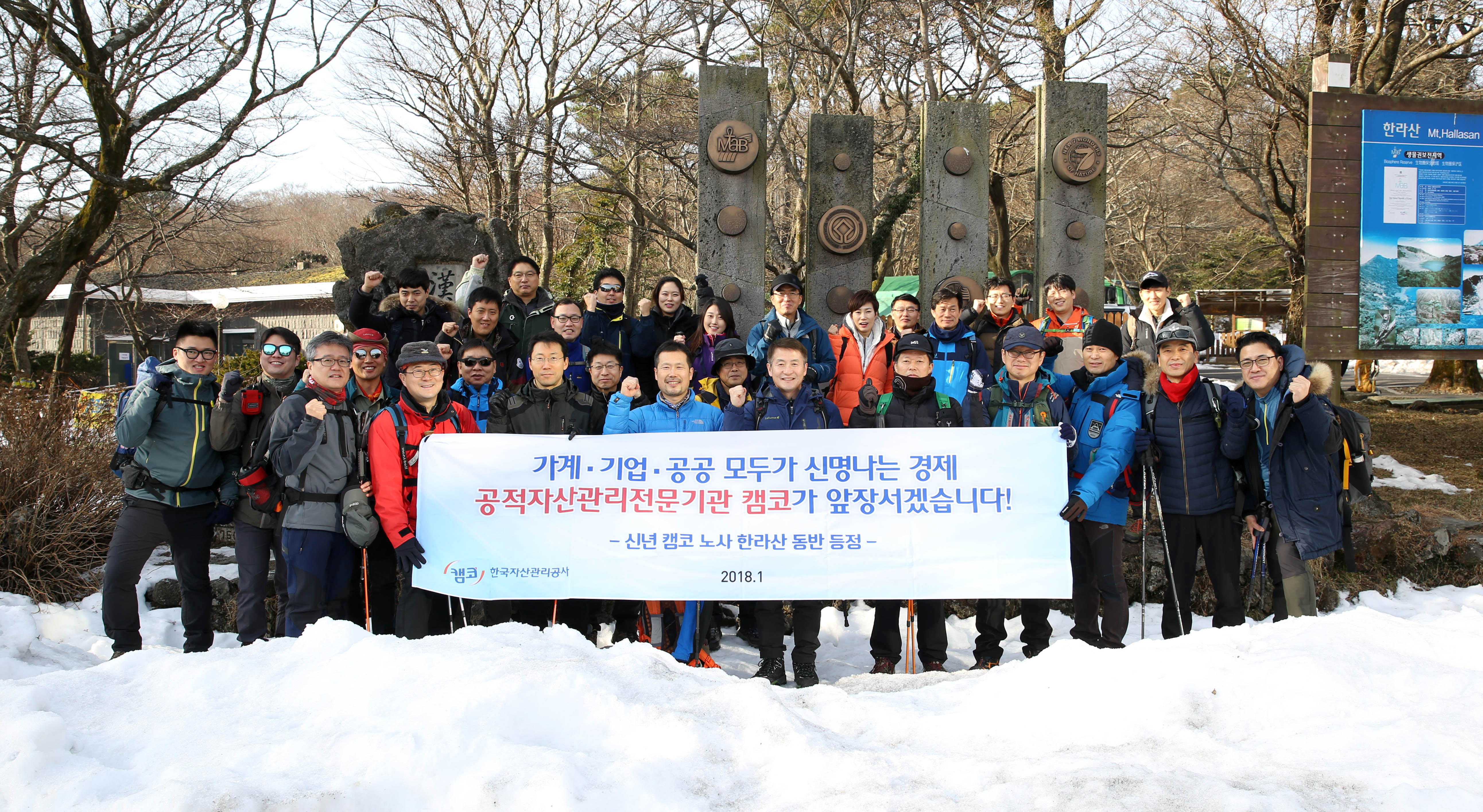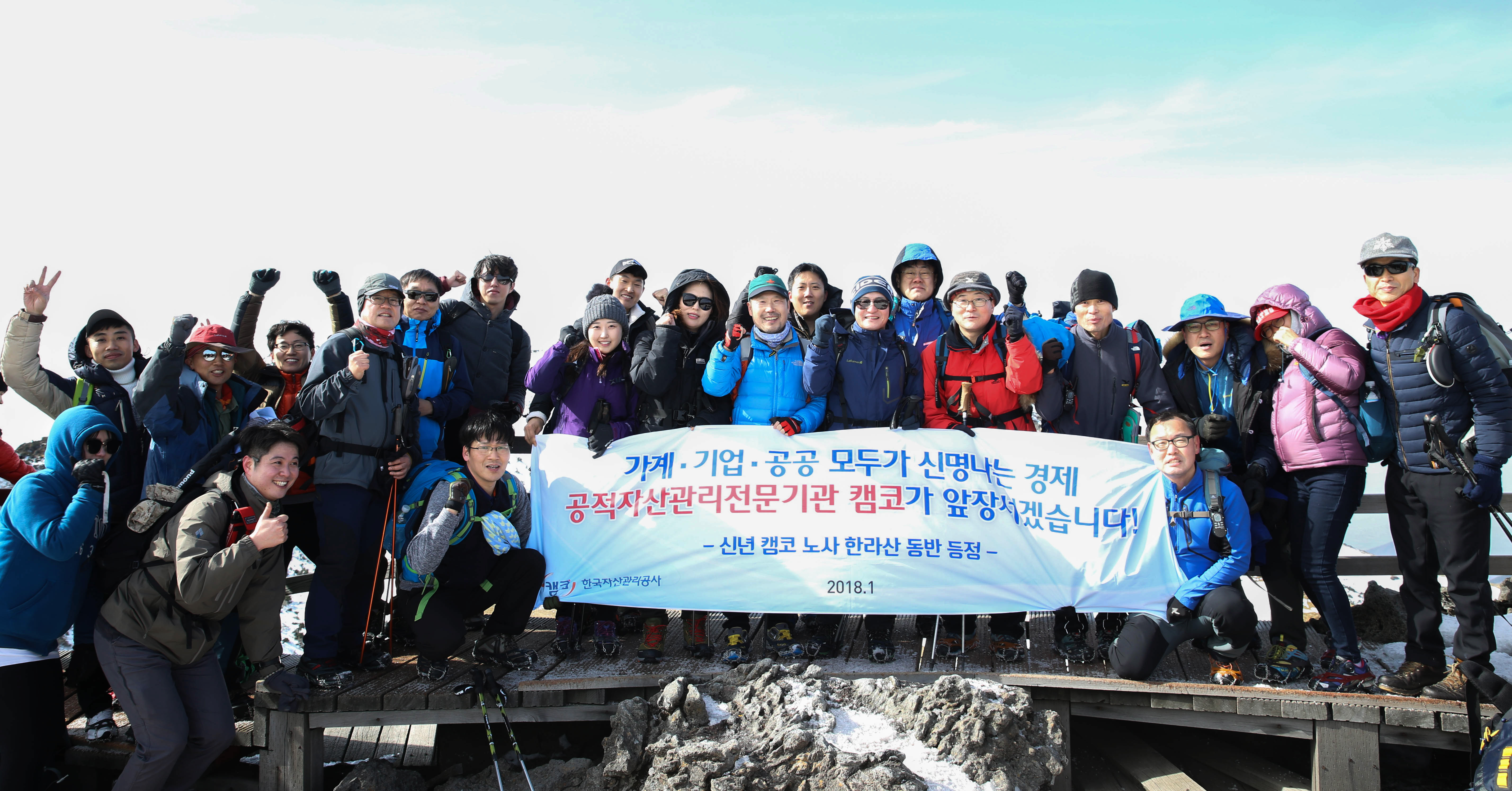 문창용 캠코 사장과 김상형 노동조합 위원장을 비롯한 임직원 40여명은 이날 국내 최고봉인 제주도 한라산 정상에 올라 2018년에도 노사간 상호 신뢰와 협력을 기반으로 일자리 창출, 서민경제 활성화와 중소기업 재기 지원 등 캠코에 주어진 공적역할을 충실히 수행하여 가계·기업·공공부문 모두가 신명나는 경제를 만들어 나가는 데 최선을 다하기로 뜻을 모았습니다. |