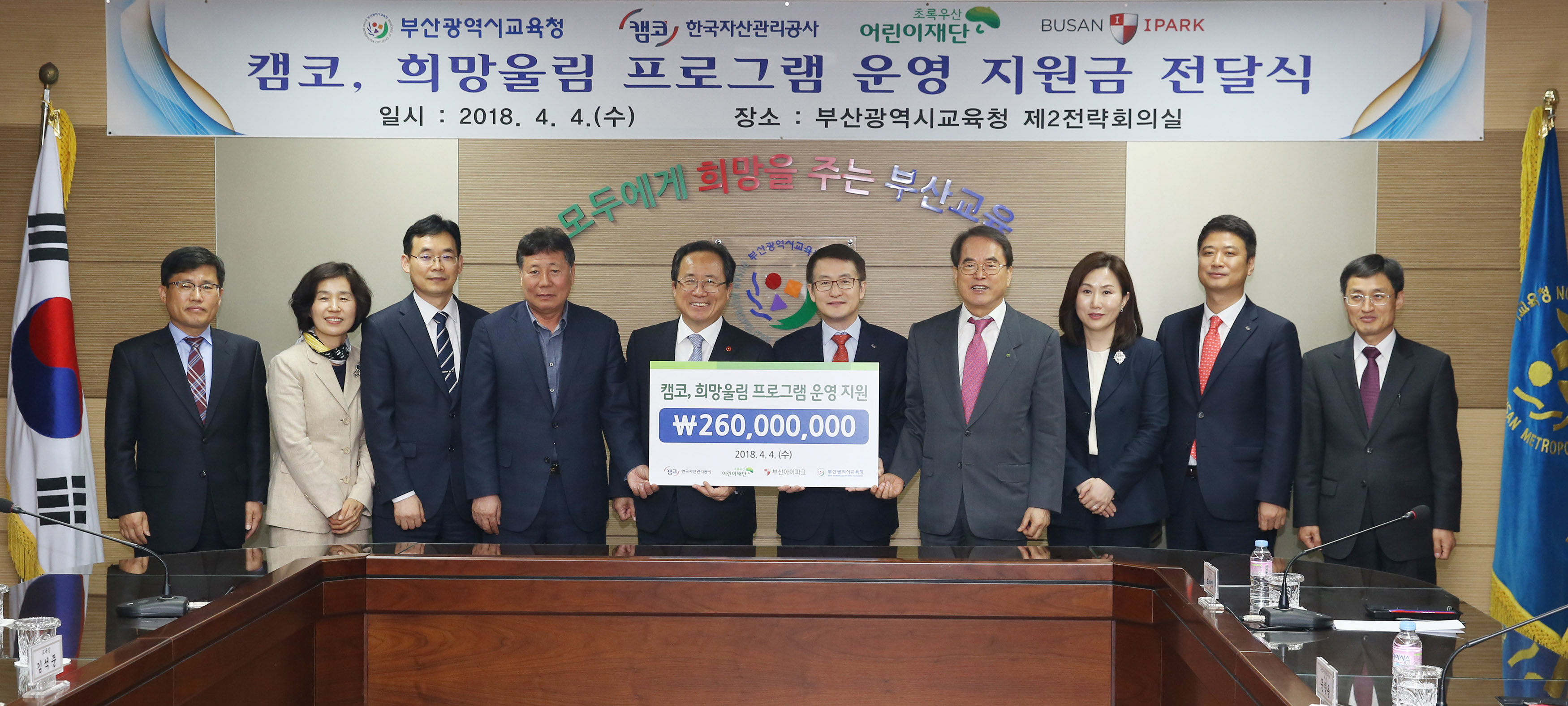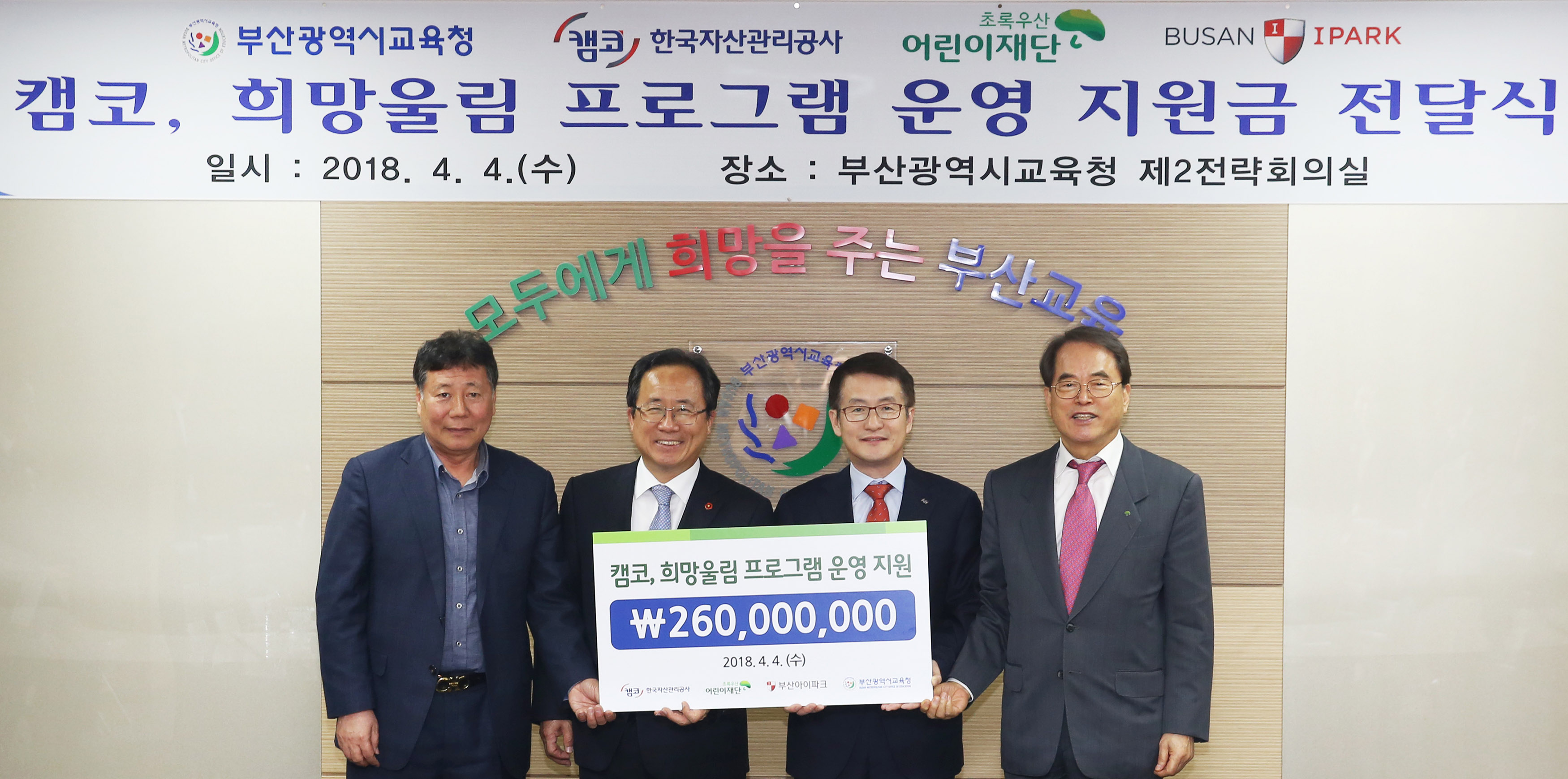 캠코(한국자산관리공사, 사장 문창용)는 문화예술과 스포츠 체험 중심의 사회공헌활동인 ‘희망울림프로그램 시즌 2’ 시행을 위해 4월 4일(수) 오후 5시 부산광역시 교육청 제2전략회의실에서 부산광역시 교육청과 초록우산 어린이재단에 희망울림프로그램 운영비 총 2억6천만원을 전달했습니다.
