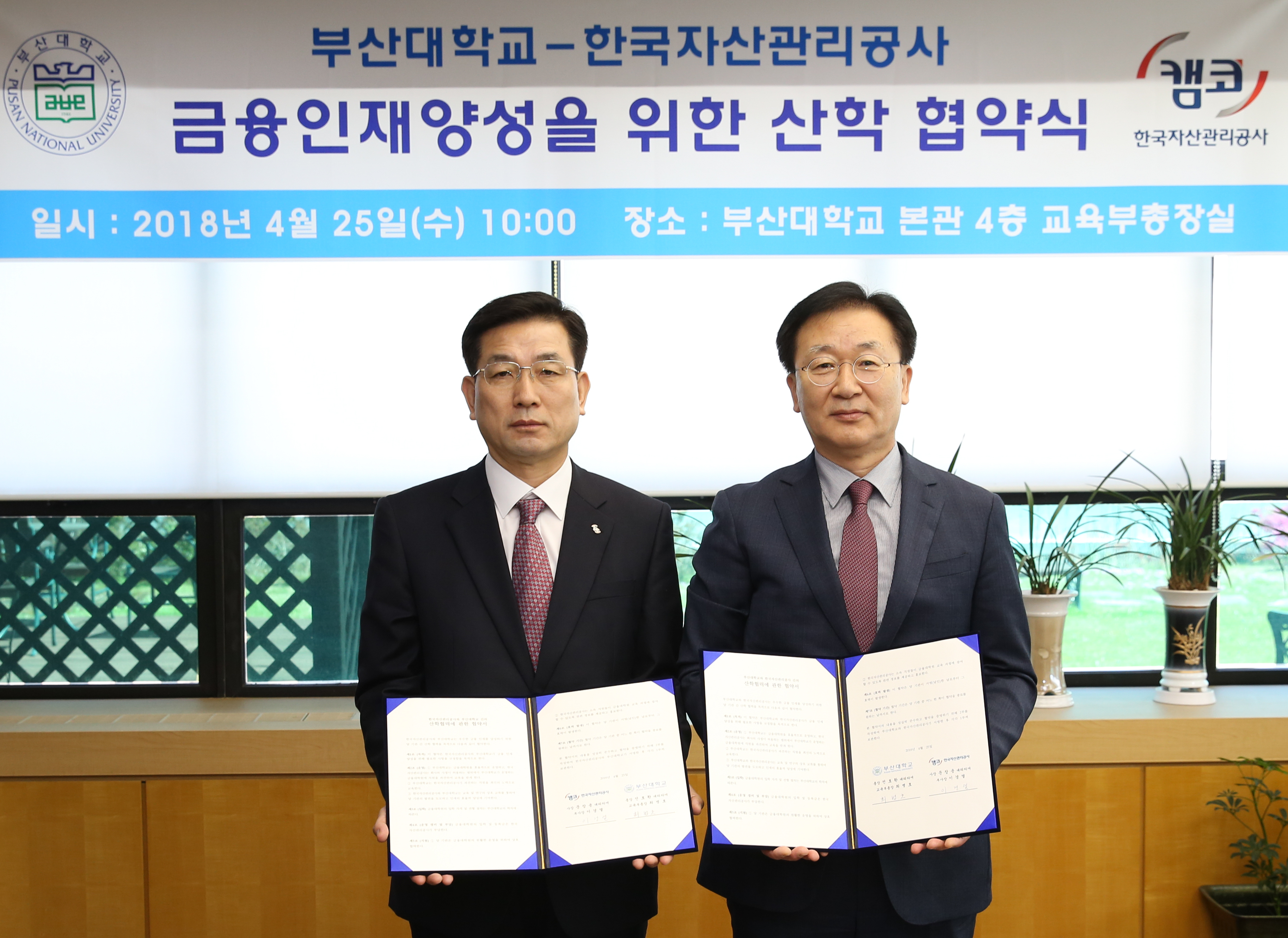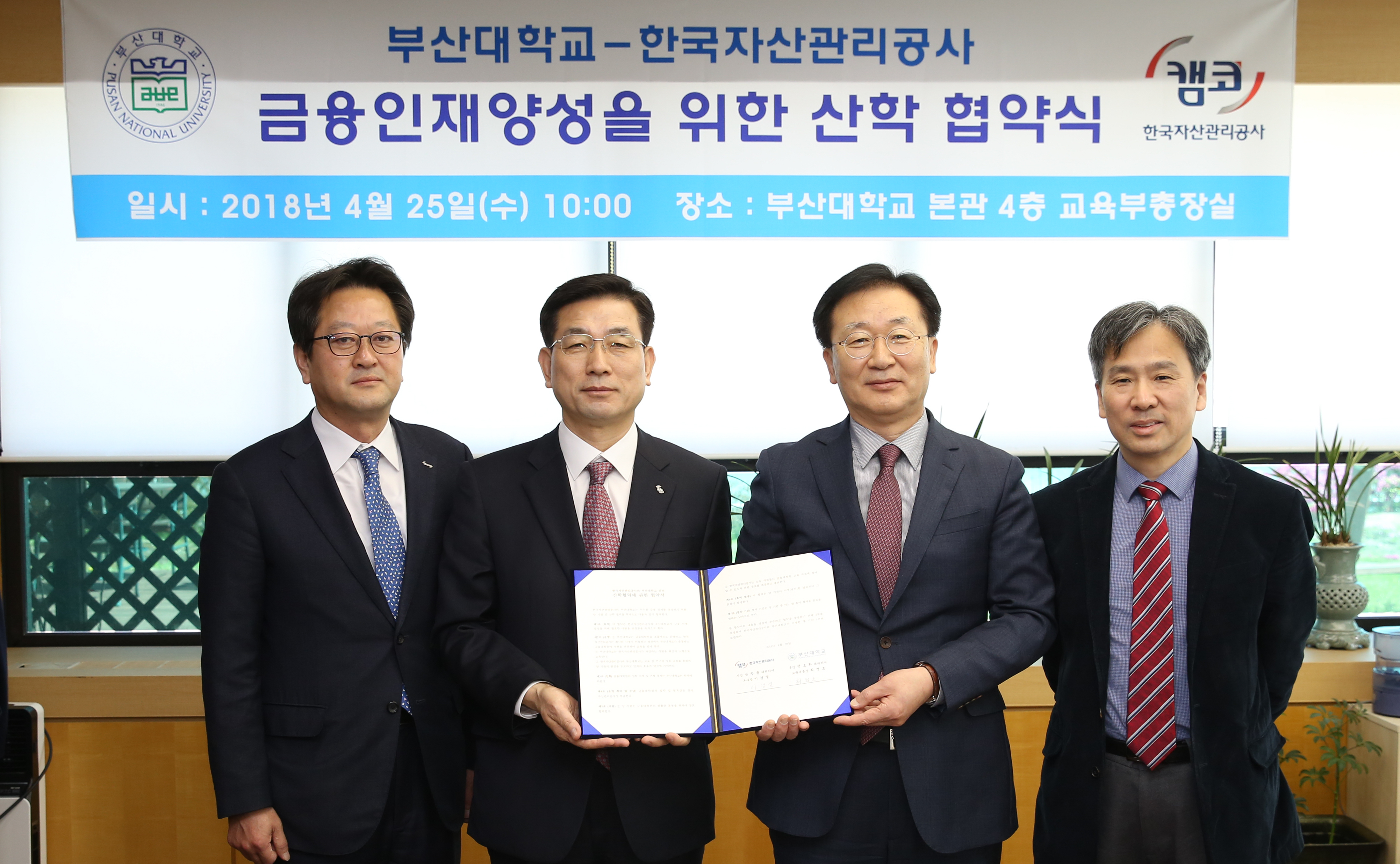 캠코(한국자산관리공사, 사장 문창용)는 4월 25일(수) 오전 10시 부산대학교 본관에서 부산대학교와 금융중심지 발전을 선도할 우수 금융전문인력 양성을 위해 「산학협력에 관한 협약(MOU)」을 체결했습니다.