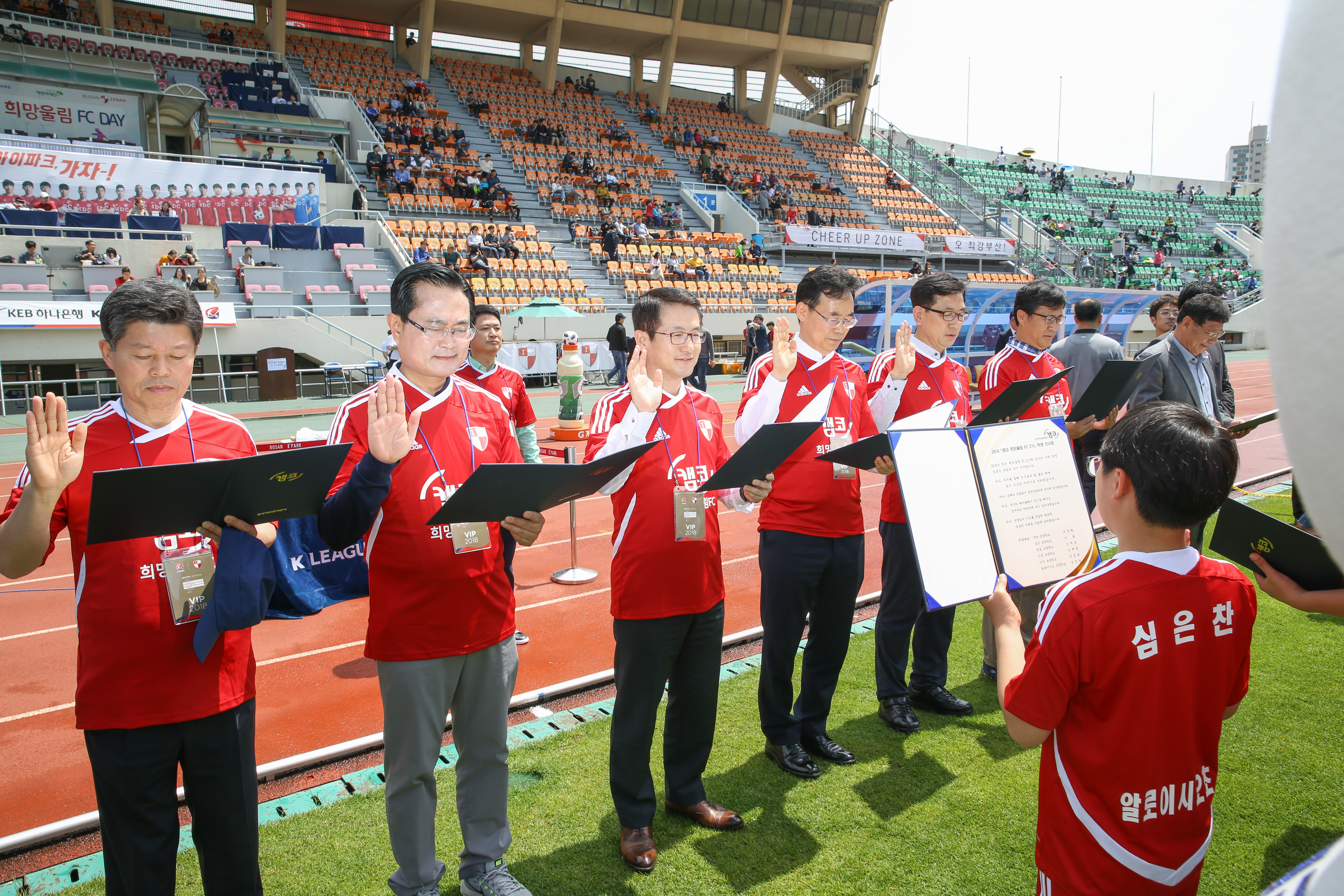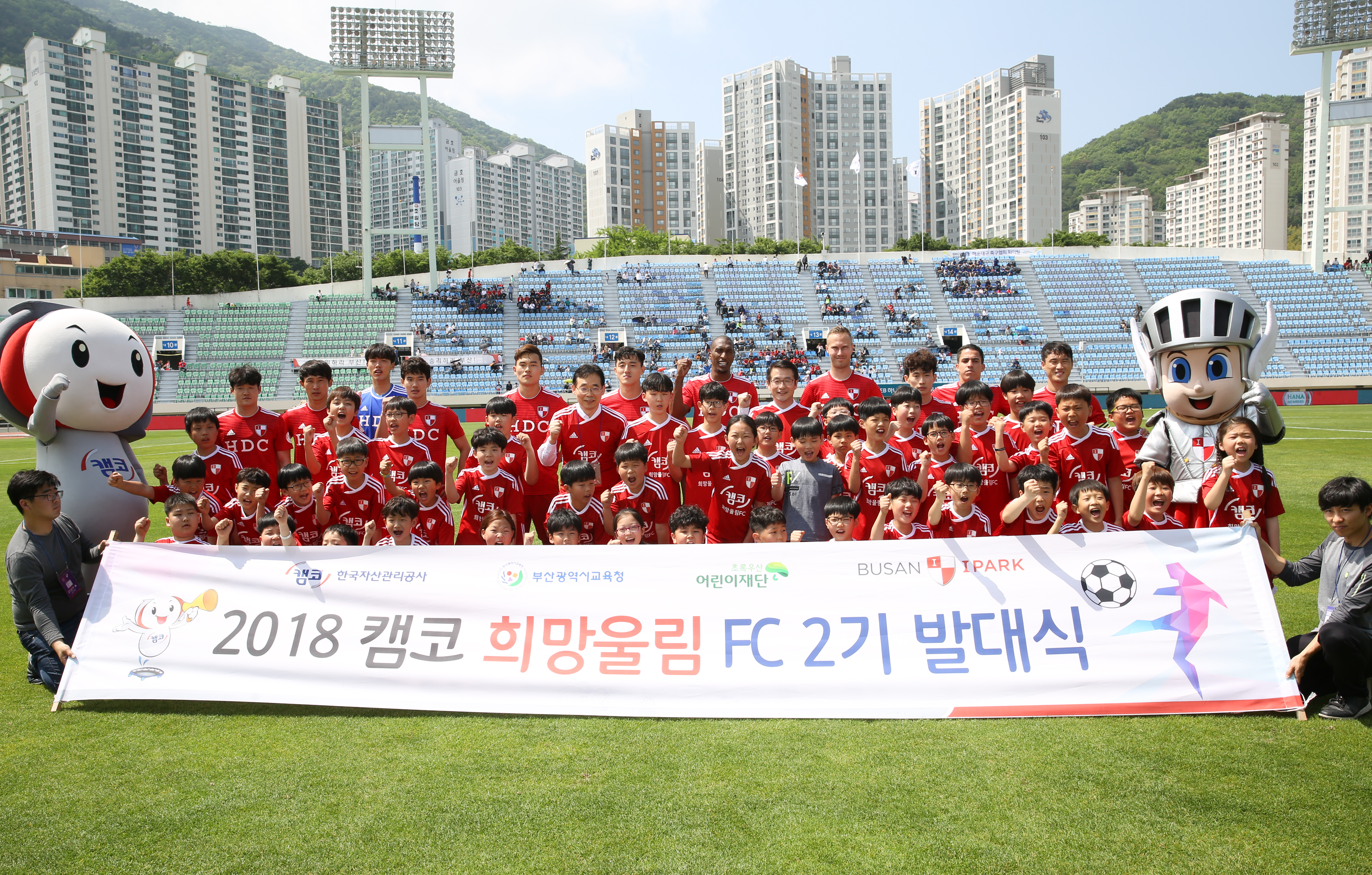 캠코(한국자산관리공사, 사장 문창용)는 5월 13일(일) 오후 1시 30분 부산구덕경기장에서 캠코 문창용 사장, 부산광역시교육청 전영근 교육국장, 부산아이파크 최만희 대표이사 등이 참석한 가운데 「캠코 희망울림 FC」어린이 축구단 2기 6개팀을 창단하고 발대식을 개최했습니다.