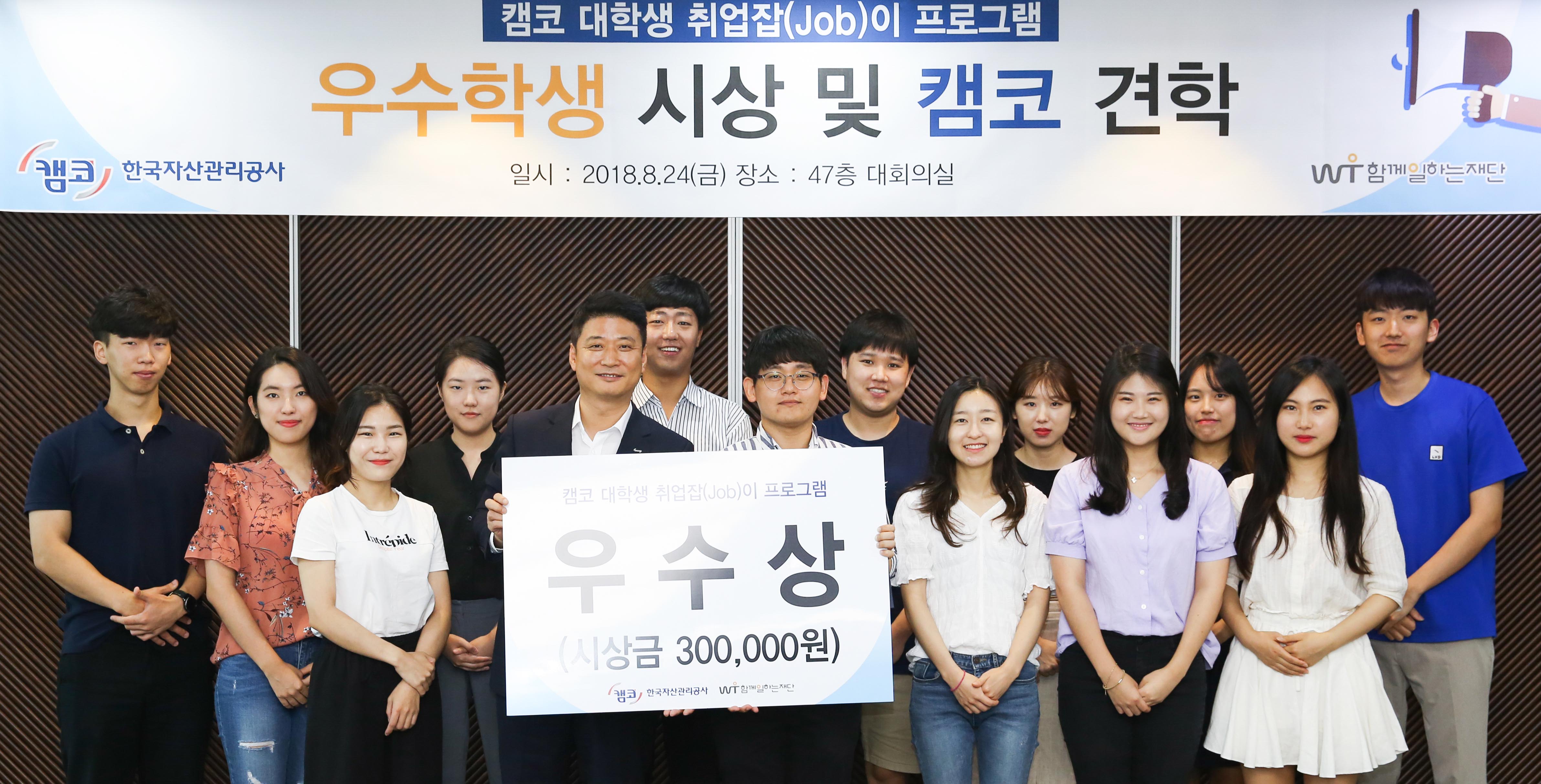 캠코(한국자산관리공사, 사장 문창용)는 8월 24일(금) 오전 11시 부산국제금융센터(BIFC) 캠코 본사에서 「캠코 희망 Replay, 대학생 취업잡(Job)이 2기 우수학생 시상」을 개최하고 프로그램 활동 우수학생 10명에게 취업준비금을 전달했습니다.