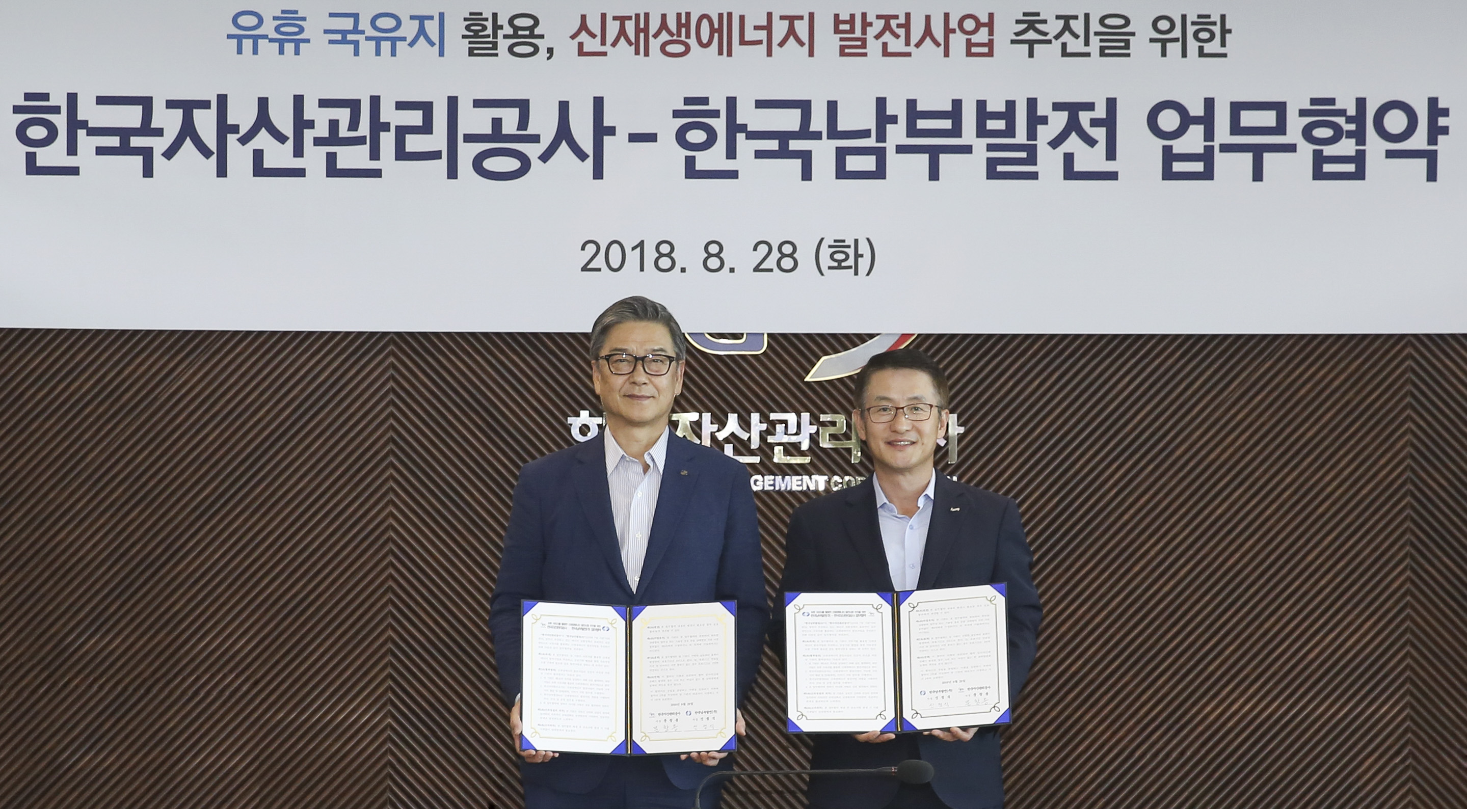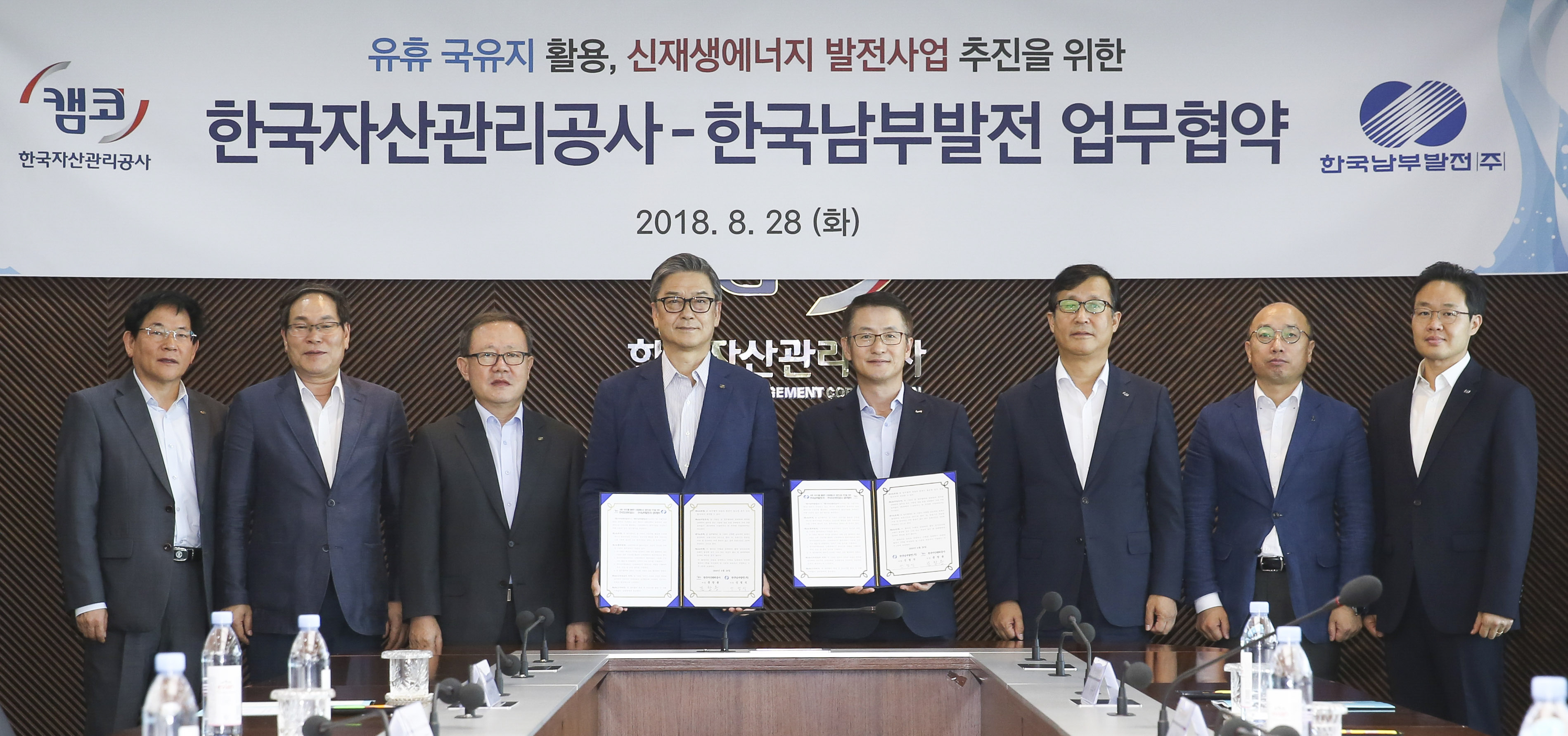 캠코(한국자산관리공사, 사장 문창용)는 8월 28일(화) 오후 3시 부산국제금융센터(BIFC) 본사 47층 대회의실에서 한국남부발전(사장 신정식)과 「유휴 국유지를 활용한 신재생에너지 발전사업 업무협약」을 체결했습니다.