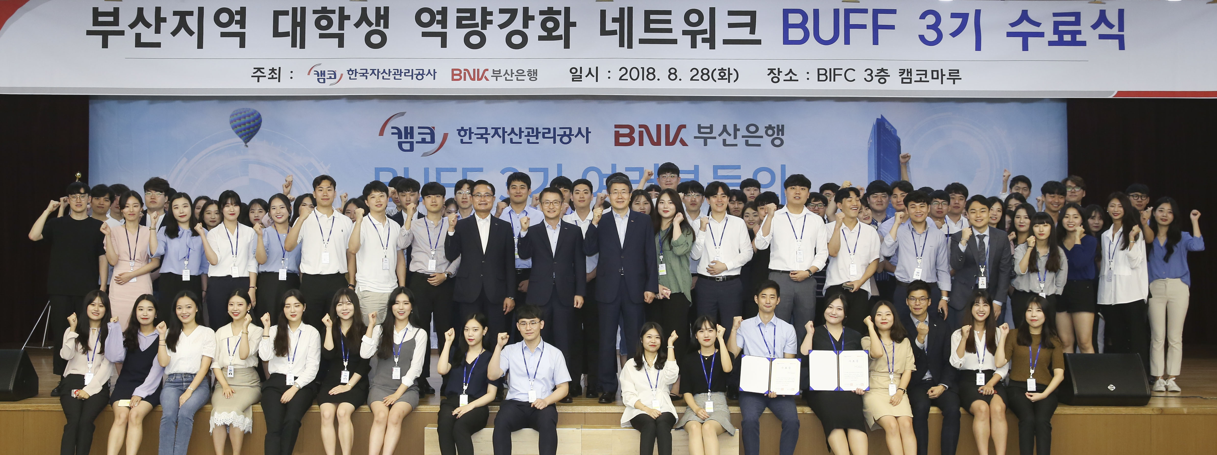 캠코(한국자산관리공사, 사장 문창용)과 BNK부산은행(은행장 빈대인)은 8월 28일(화) 10시 30분 부산국제금융센터 3층 캠코마루에서 문창용 캠코 사장, 성동화 BNK부산은행 부행장과 BUFF 3기 학생 등 120여명이 참석한 가운데 「부산지역대학생 역량강화 네트워크(BUFF)3기」 수료식을 가졌습니다.