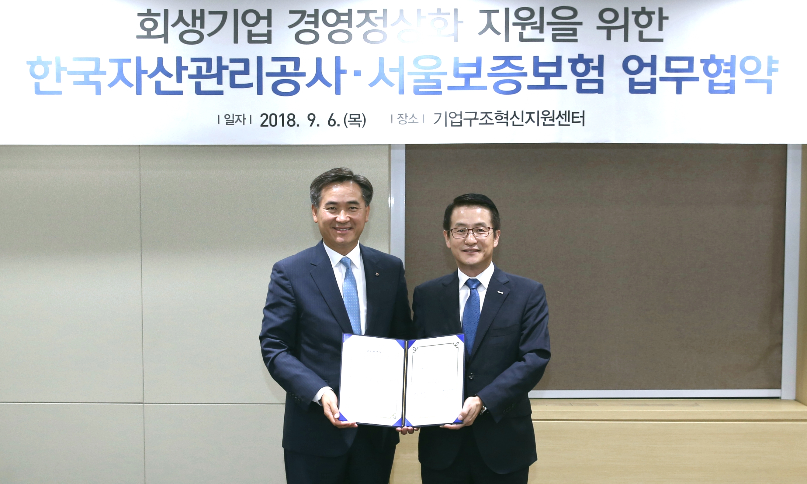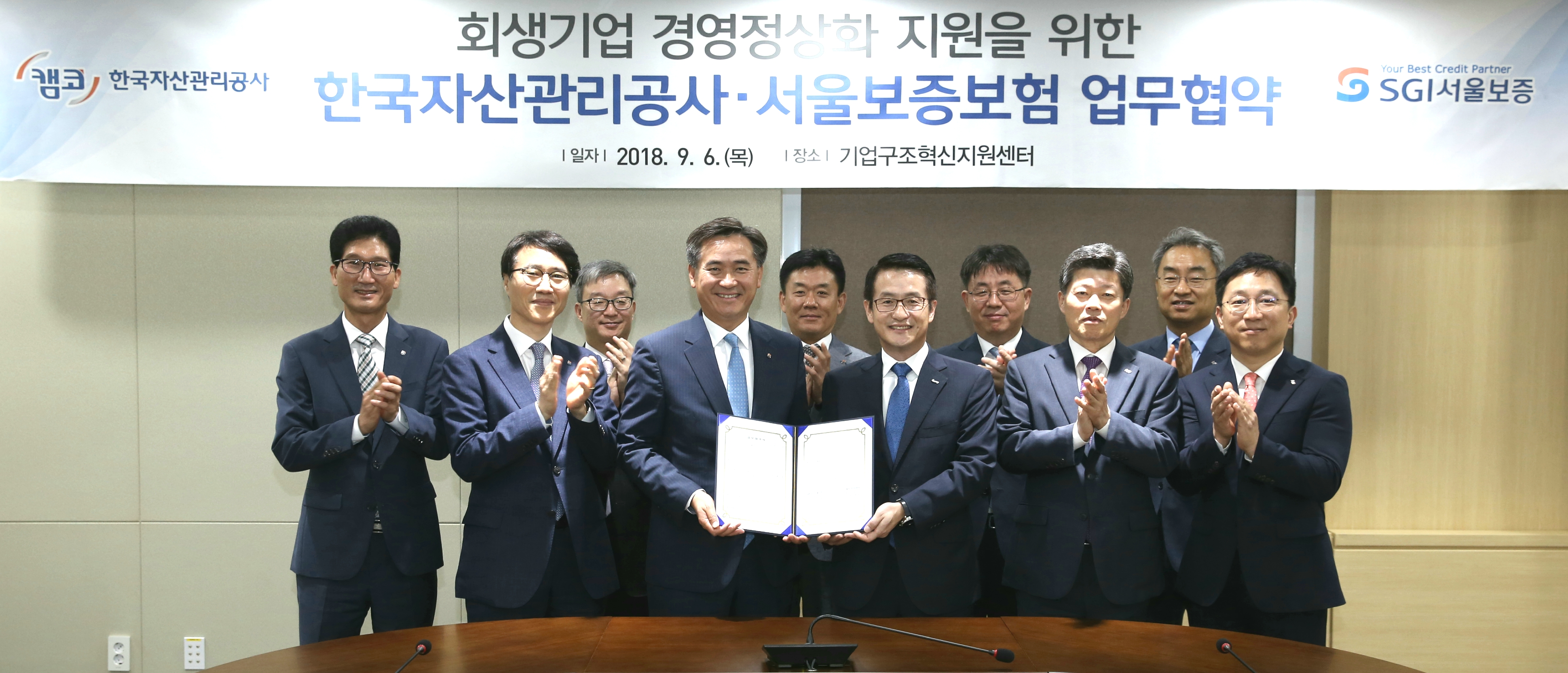 캠코(한국자산관리공사, 사장 문창용)는 9월 6일(목) 오전 10시 캠코양재타워(서울시 도곡동 소재) 20층 기업구조혁신지원센터(서울센터)에서 SGI서울보증(대표이사 김상택)과 「회생기업 경영정상화 지원을 위한 업무협약」을 체결했습니다.