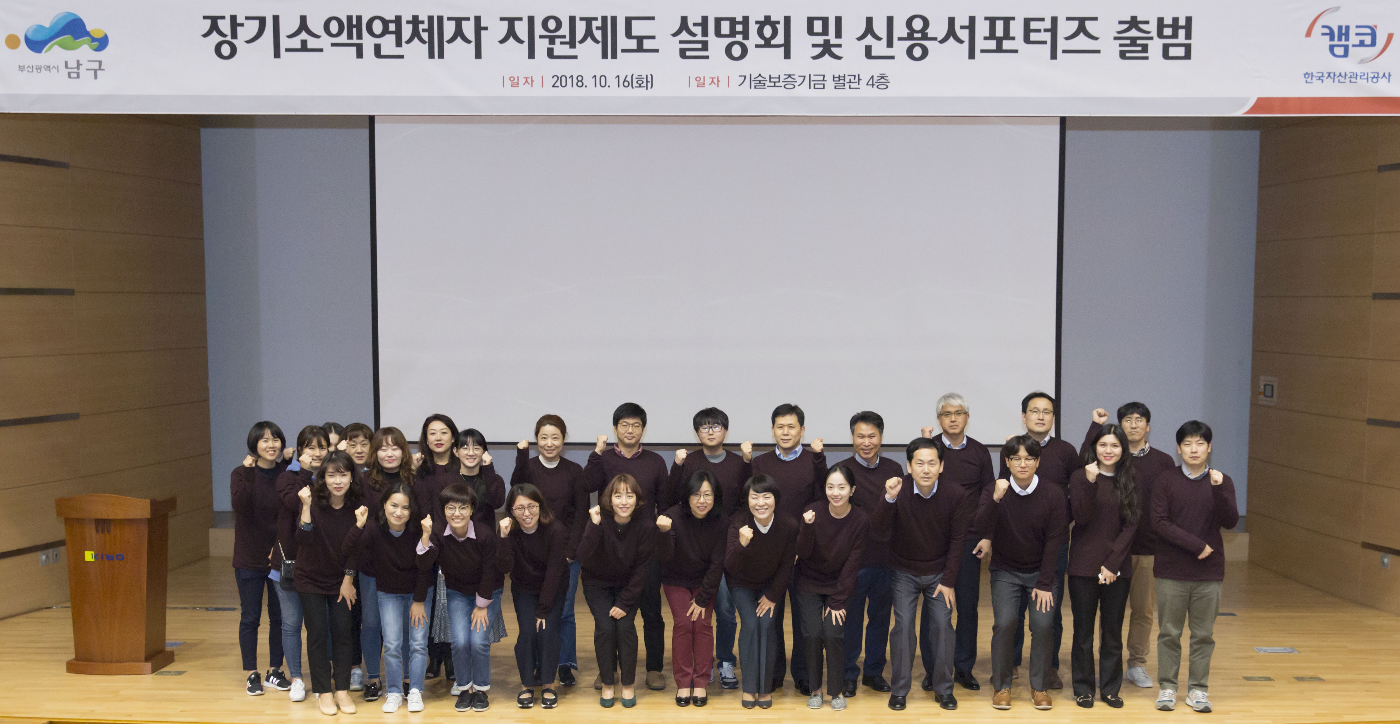 캠코(한국자산관리공사, 사장 문창용)는 10월 16일(화) 오후 4시 기술보증기금 별관 대강당(부산 문현동 소재)에서 캠코 천경미 가계지원본부장, 부산시 남구청 사회복지담당 공무원 및 통장, 부산지역자활센터 복지상담사 등 100여명이 참석한 가운데 「장기소액연체자 재기지원 설명회 및 신용서포터즈 출범식」을 개최했습니다.