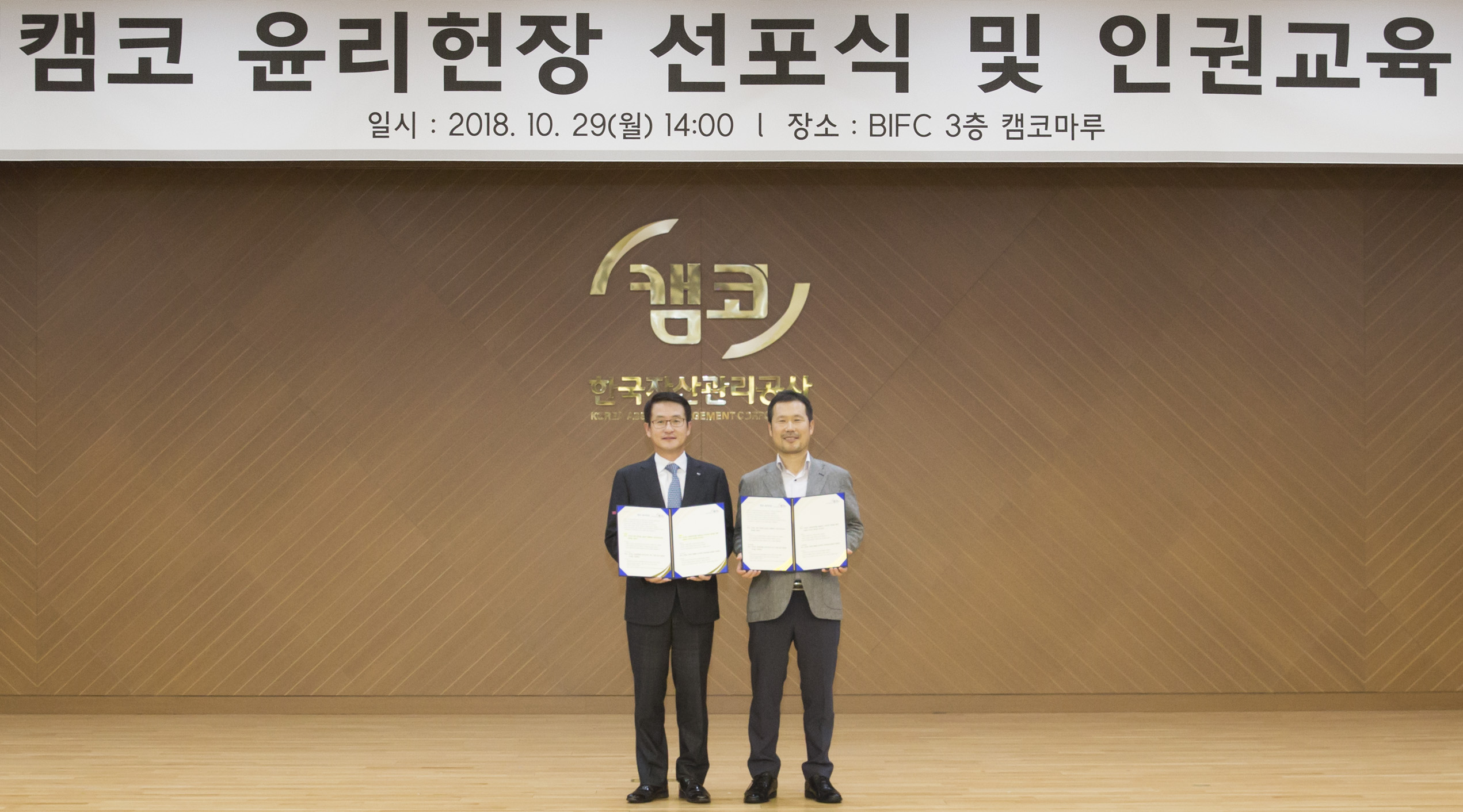 캠코(한국자산관리공사, 사장 문창용)는 10월 29일(월) 오후 2시 부산국제금융센터(BIFC) 본사 3층 캠코마루에서 문창용 사장, 김상형 노동조합 위원장 및 임직원이 참석한 가운데 「캠코 윤리헌장 선포식」을 개최했습니다.