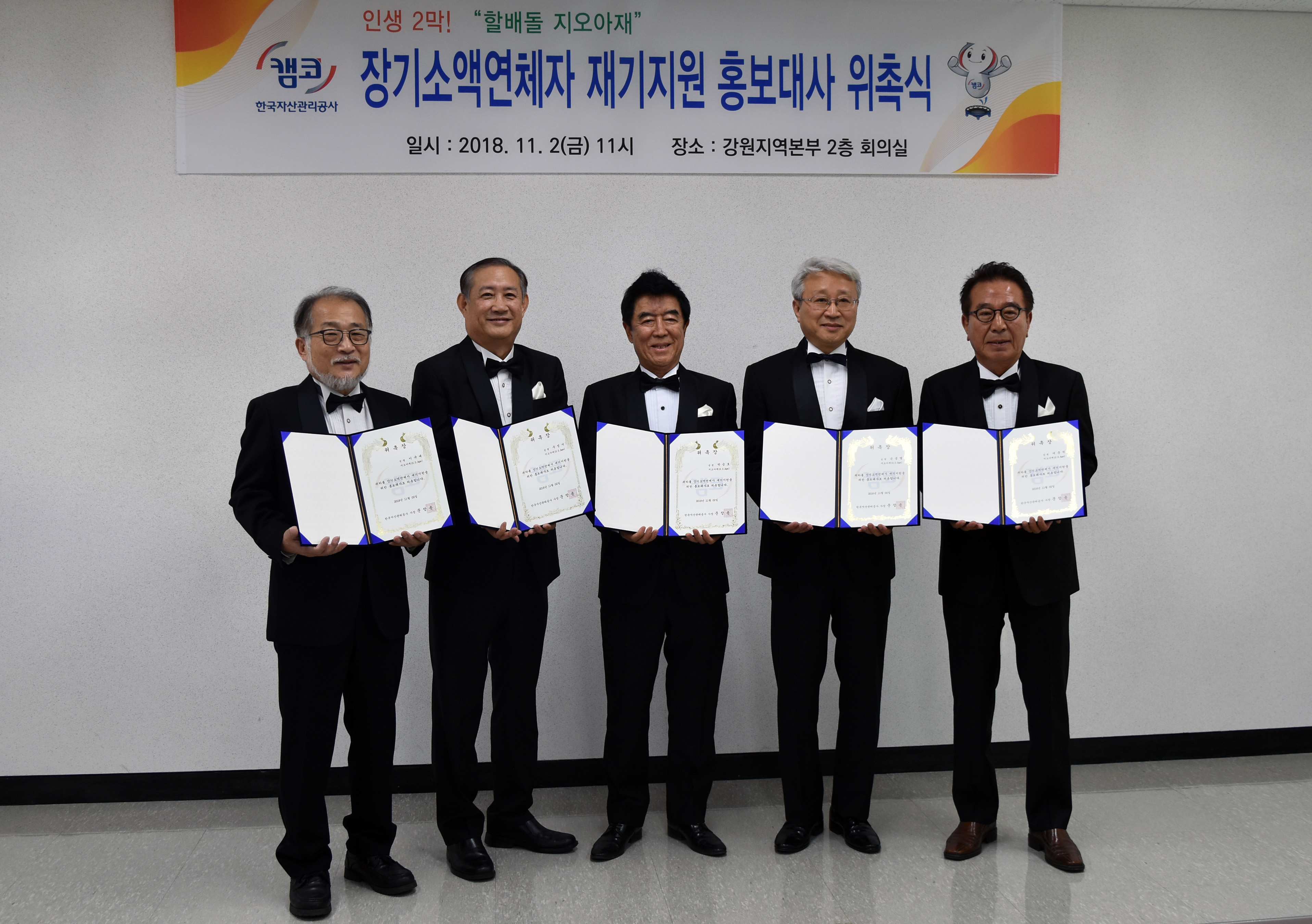 캠코(한국자산관리공사, 사장 문창용)는 11월 2일(금) 오전 11시 캠코 강원지역본부 2층 회의실(강원도 강릉시 옥천동 소재)에서 중창그룹 '지오아재'를 장기소액연체자 지원제도 홍보대사로 위촉하고 길거리 홍보 캠페인 활동에 나섰습니다.