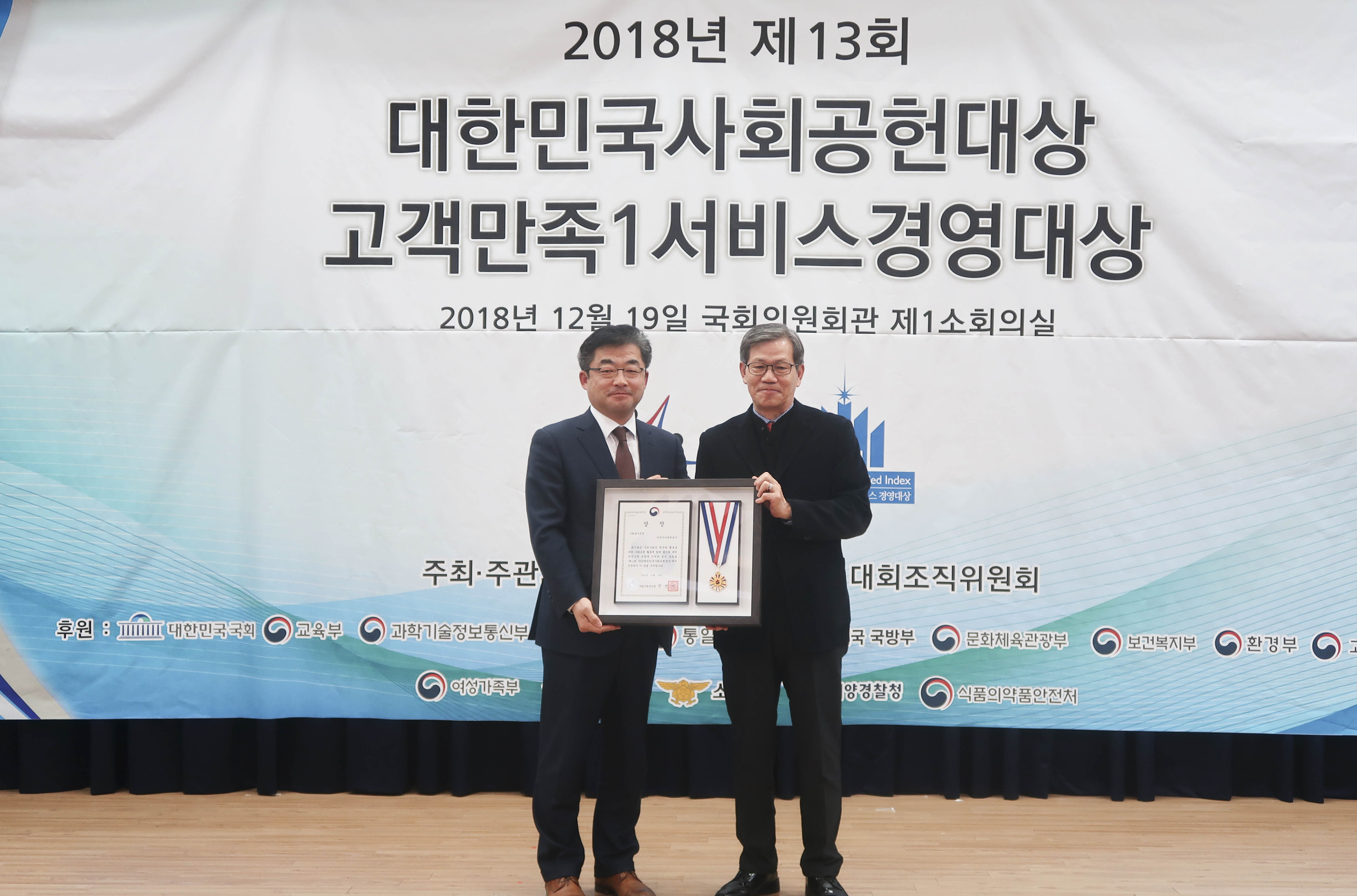캠코(한국자산관리공사, 사장 문창용)는 12월 19일(수) 오후 2시 한국서비스산업진흥원 주최로 국회의원회관에서 열린 「2018년 대한민국 사회공헌대상」 시상식에서 사회적 가치 제고 및 일자리 창출 중심의 사회공헌 추진 노력 및 성과를 인정받아 일자리 창출 부문 '대한민국 사회공헌대상'을 수상했다고 밝혔습니다.