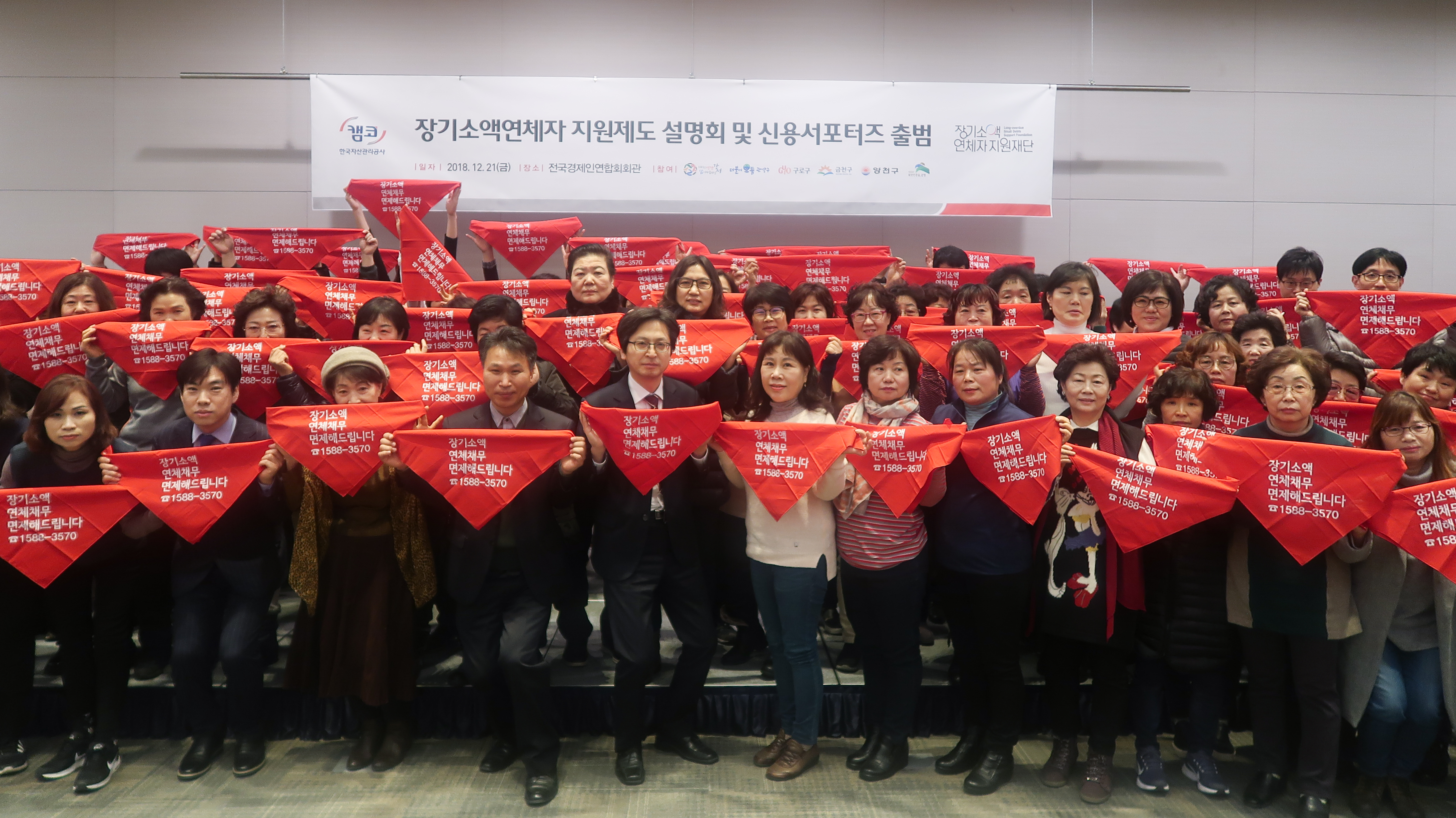 캠코(한국자산관리공사, 사장 문창용)는 12월 21일(금) 오전 11시 전국경제인연합회 컨퍼런스센터(서울 영등포구 여의도동 소재)에서 서울시 강서, 관악, 구로, 금천, 양천, 은평구 사회복지담당 공무원, 통장, 복지상담사 등 200여명이 참석한 가운데 「장기소액연체자 지원제도 설명회 및 신용서포터즈 출범식」을 개최했습니다.