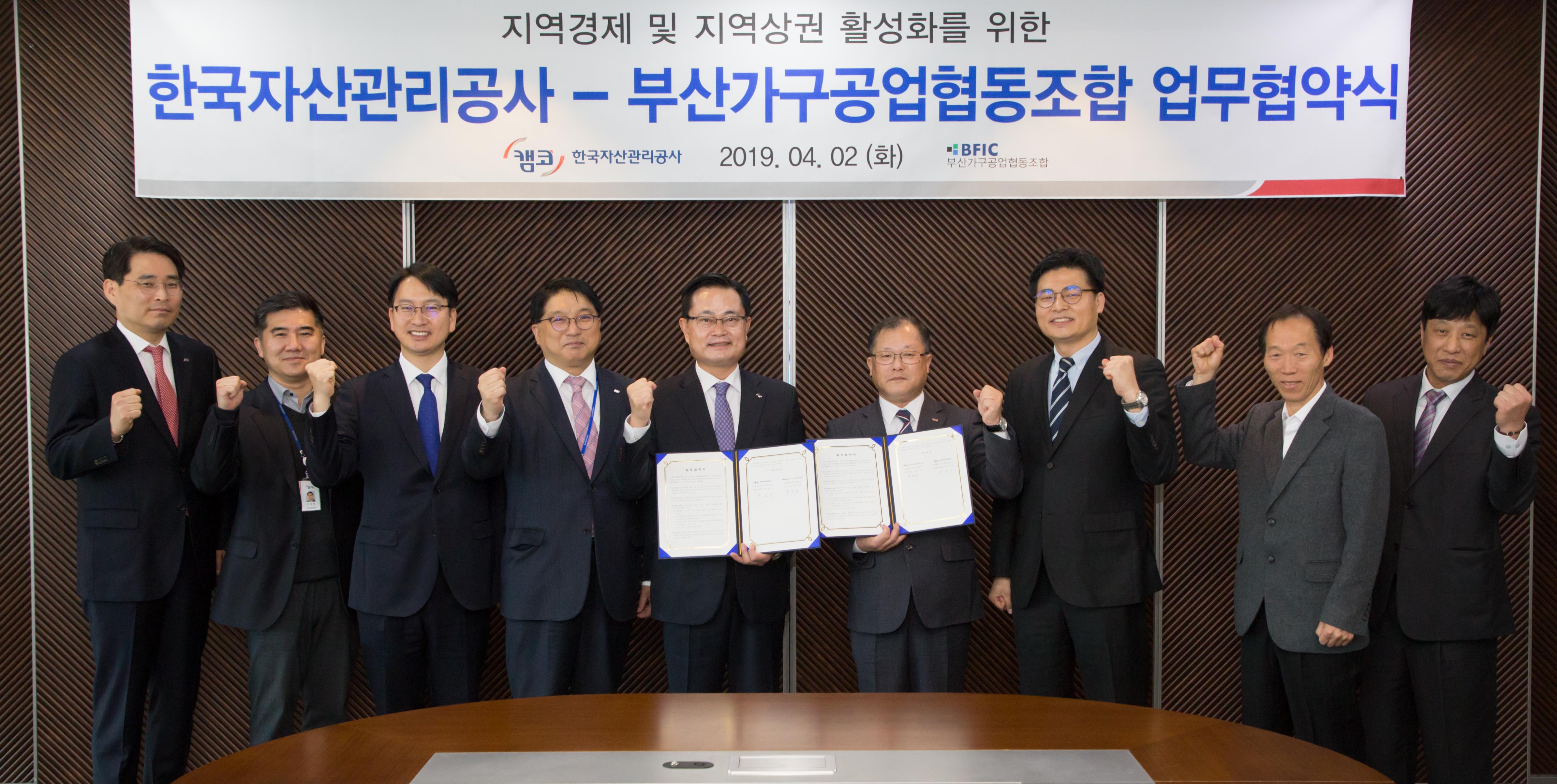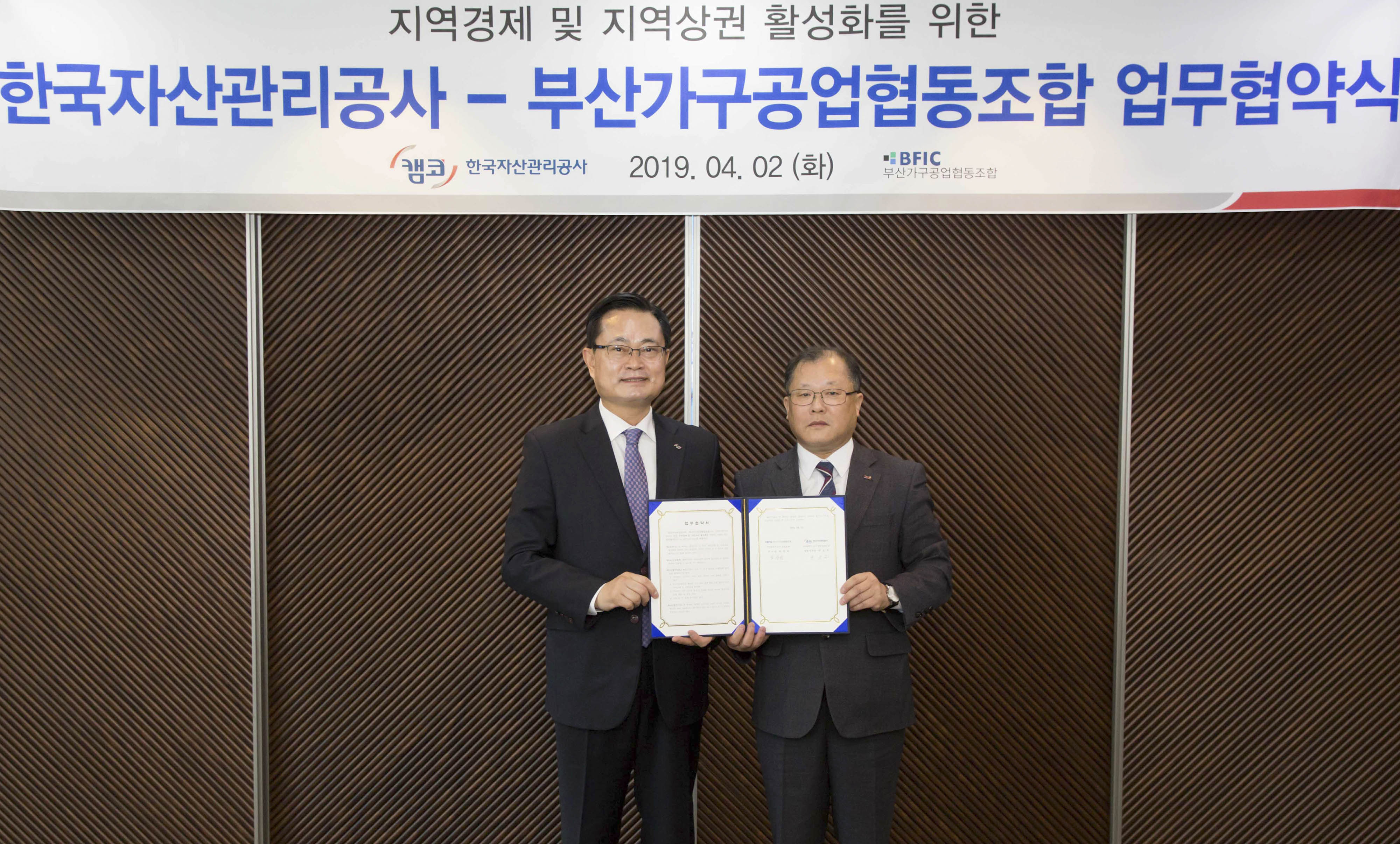 캠코(한국자산관리공사, 사장 문창용)는 4월 2일(화) 오전 10시 부산국제금융센터(BIFC) 본사 47층 대회의실에서 부산가구공업협동조합(이사장 박찬원)과 「지역경제·지역 상권 활성화를 위한 업무협약」을 체결했습니다.