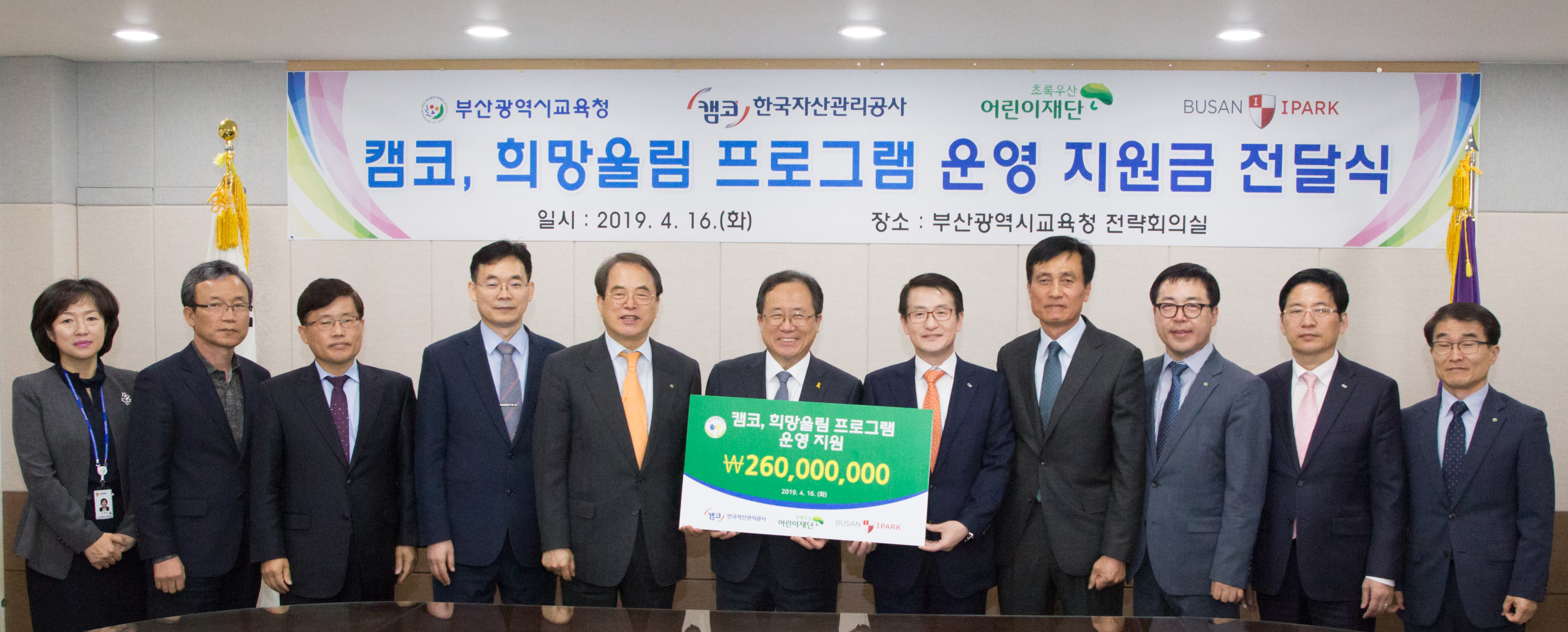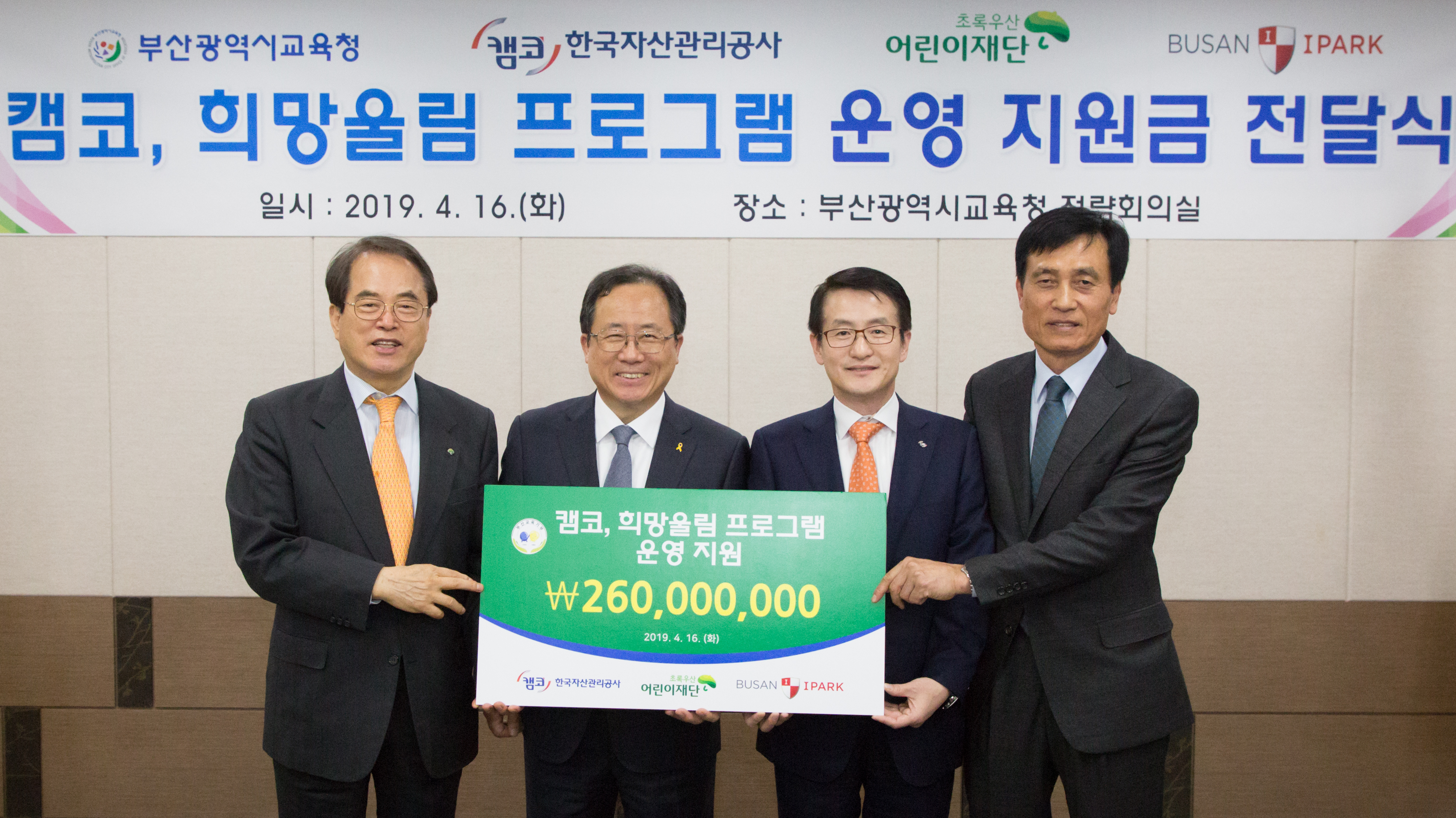 캠코(한국자산관리공사, 사장 문창용)는 4월 16일(화) 오후 5시 부산광역시 교육청(부산진구 화지로 소재)에서 문화예술과 스포츠 활동 중심의 사회공헌활동인 '희망울림프로그램 시즌3' 운영비 총 2억 6천만원을 부산광역시 교육청에 전달했습니다.