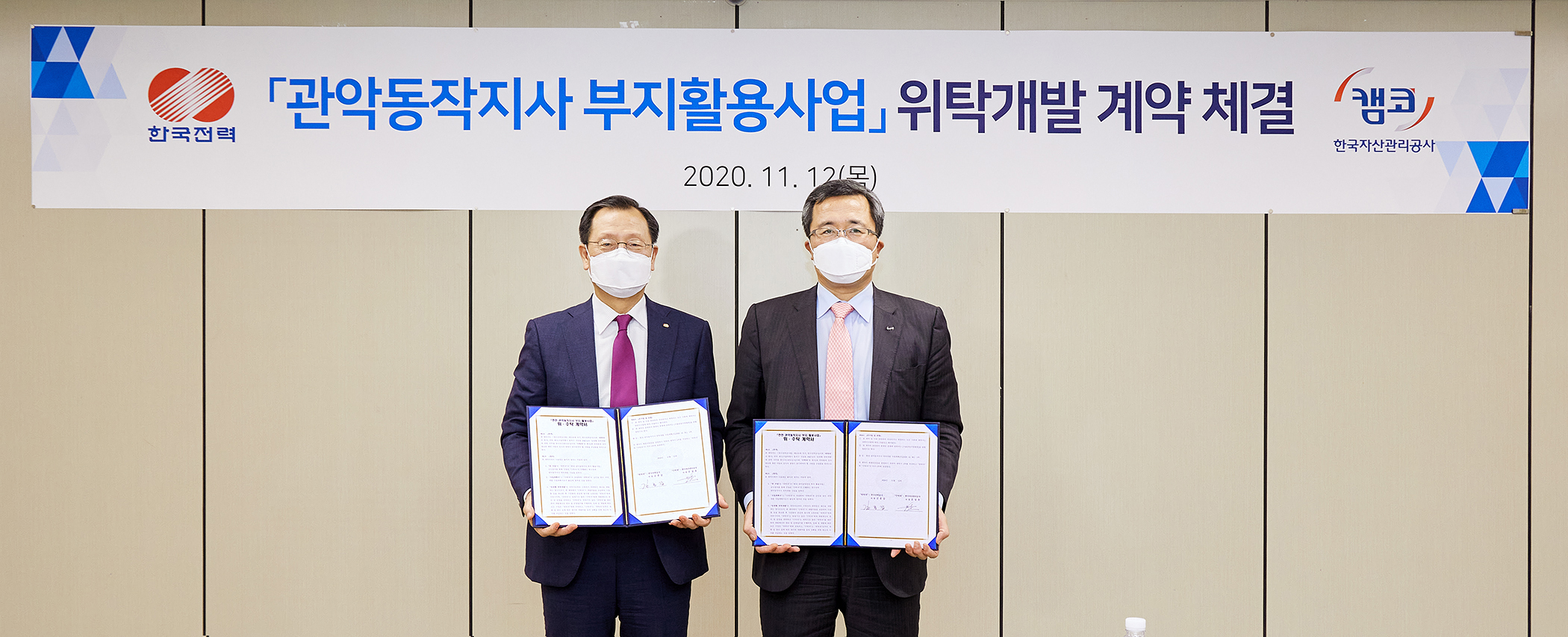 캠코(한국자산관리공사)는 11월 12일(목) 한전 아트센터(서초구 서초동 소재)에서 문성유 캠코 사장, 김종갑 한국전력공사(한전) 사장 등이 참석한 가운데 한전과 약 800억원 규모의 「한전 관악동작지사 부지 활용사업 위ㆍ수탁계약」을 체결했다.