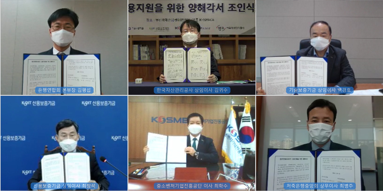 캠코(한국자산관리공사, 사장 문성유)는 12월 8일(화) 전국은행연합회(회장 김광수), 저축은행중앙회(회장 박재식), 기술보증기금(이사장 정윤모), 신용보증기금(이사장 윤대희), 중소벤처기업진흥공단(이사장 김학도)과 「법인연대보증인 신용지원을 위한 양해각서」를 체결했다고 밝혔다.
