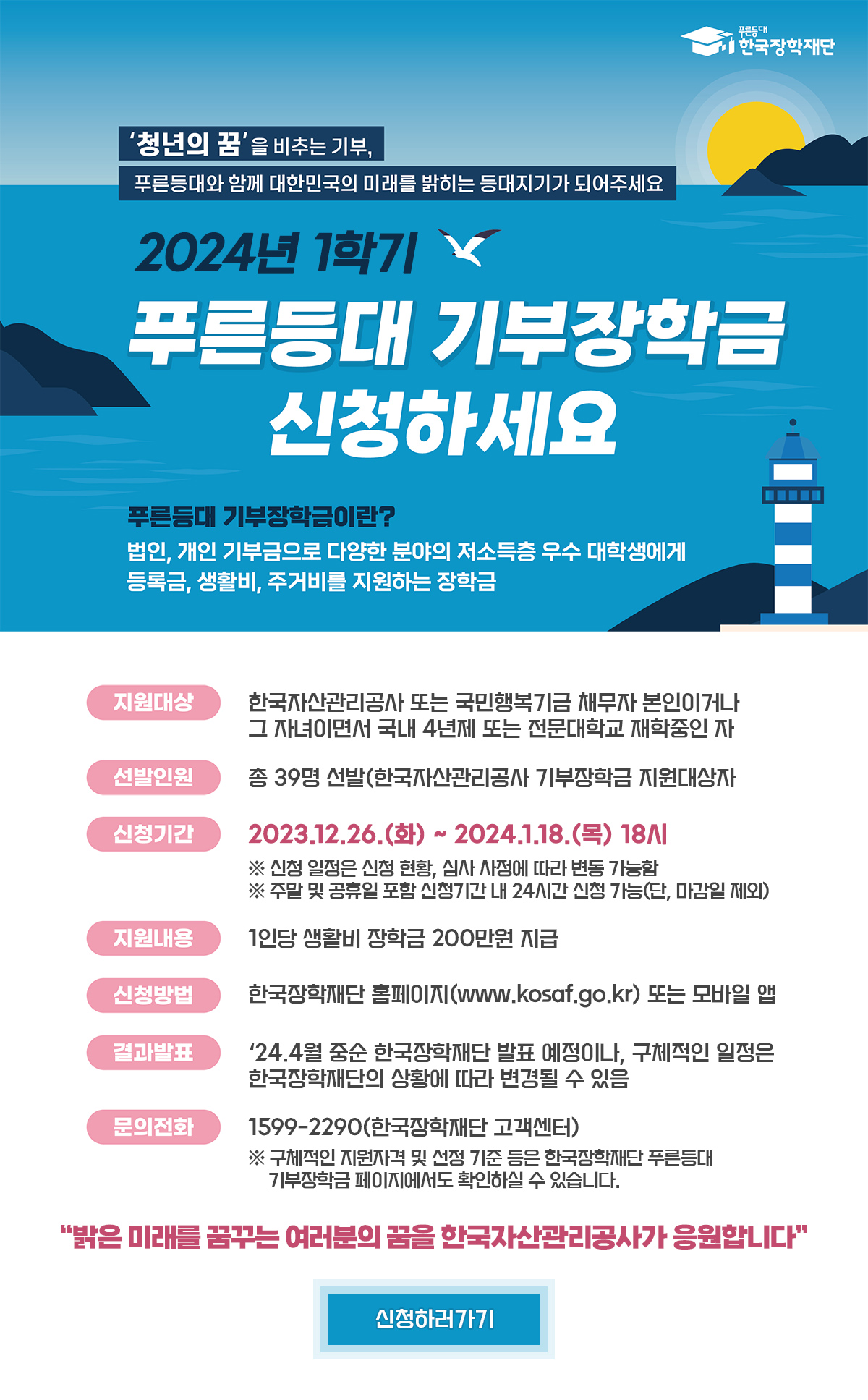 한국장학재단 푸른등대 기부장학금 신청 및 접수 공고