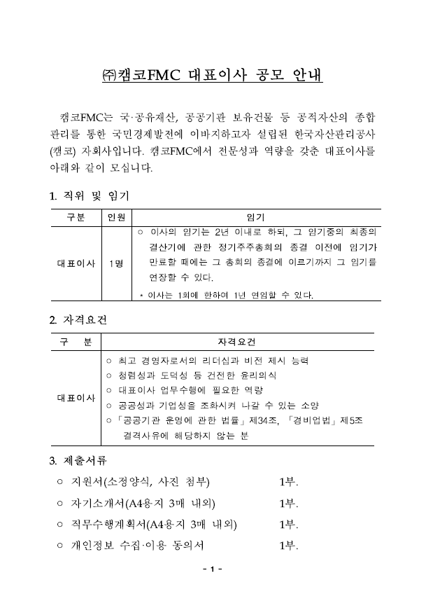 (주)캠코에프엠씨 대표이사 공모 안내 상세보기