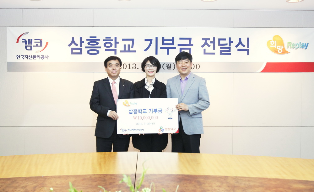 캠코는 지난 5월 20일 삼성동 소재 캠코 별관에서 새터민 학교인 삼흥학교에 학생 급식비 지원을 위한 기부금을 전달 하였습니다.
