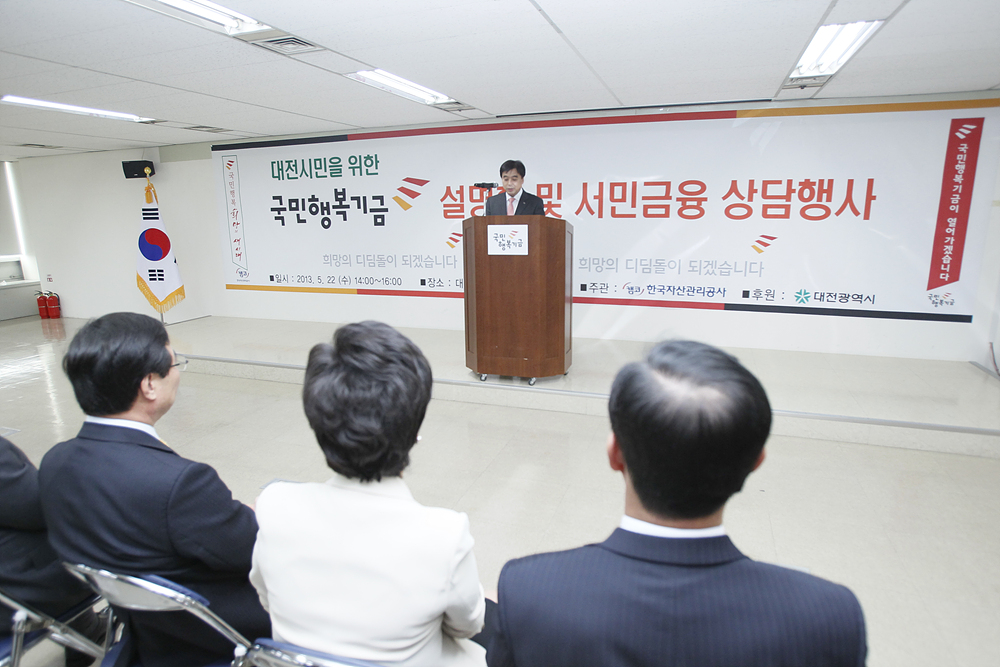 캠코(한국자산관리공사, 사장 장영철)는 5월 22일(수) 대전복지재단 대강당에서 장영철 캠코 사장, 김인홍 대전광역시 부시장, 곽영교 대전광역시의회 의장, 김제락 대전지방고용노동청장, 정진철 대전복지재단 대표이사 등이 참여한 가운데 「대전지역 저소득 소외계층을 위한 국민행복기금 설명회 및 취업․금융애로사항 현장상담」행사를 개최하였습니다.