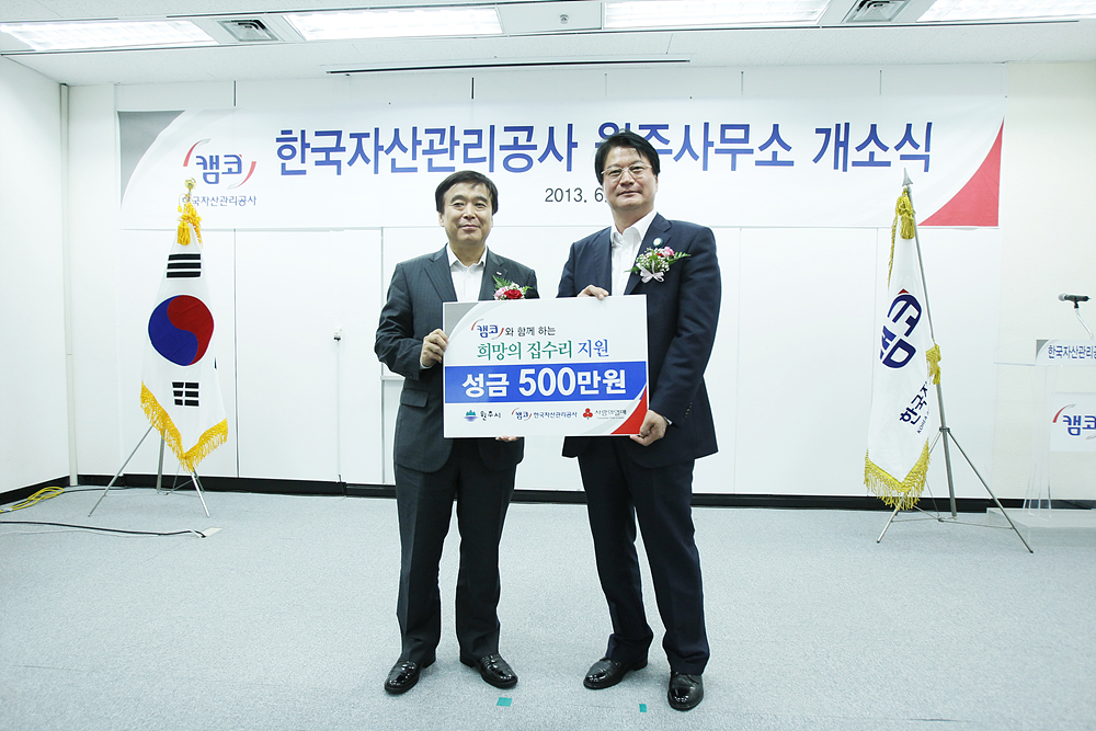 캠코 원주사무소는 이날 오전 김상표 경제부지사, 김기선 국회의원, 원창묵 원주시장, 노재수 평창부군수, 이해규 원주상공회의소 회장, 우성호 강원도민일보 영서본부장 등 각급 기관장과 캠코 임직원이 참석한 가운데 원주시 단계동에서 개소식을 갖고 영서 남부지역 주민들에 대한 지역 밀착형 서민금융지원 업무를 시작하였습니다.
