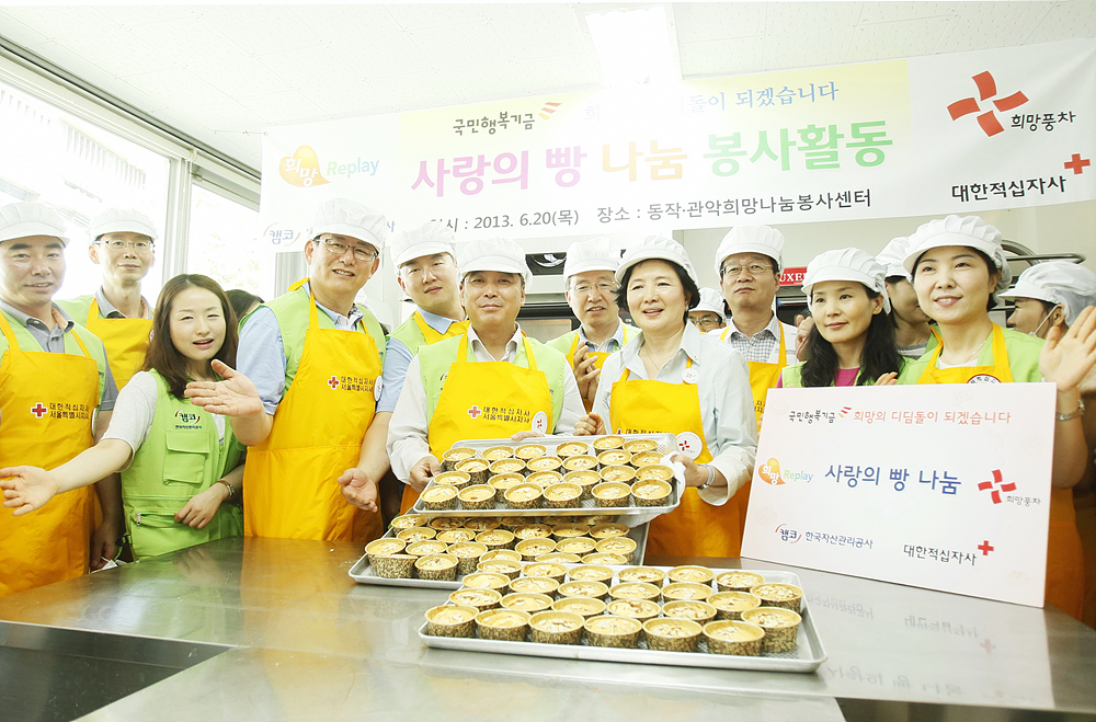 캠코(한국자산관리공사, 사장 장영철)와 대한적십자사(총재 유중근)는 6월 20일(목) 10시 서울 동작관악 적십자 희망나눔봉사센터를 포함한 전국 11개 지역 봉사센터에서 어려운 이웃에게 희망을 주기 위해 공동으로 사랑의 빵 나눔 봉사활동을 펼쳤습니다.