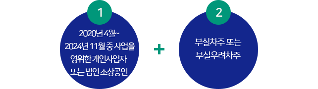 | ② 부실차주 / 부실우려차주 | (부실차주) 1개 이상의 대출에서 3개월 이상 장기연체가 발생한 차주 (부실우려차주) ▶ 코로나 발생 이후('20년 4월) 폐업(개인사업자만) 혹은 6개월 이상 휴업중인 자(폐업신고 및 휴업신고 필요) ▶ 만기연장·상환유예 이용차주로서 금융회사의 추가 만기연장이 어려운 차주(내입 및 가산금리 인상 등 포함) 또는 이자유예 이용 중인 차주 ▶ 국세·지방세·관세 체납으로 신용정보관리대상 등재 차주 ▶ 신용평점 하위차주 또는 고의성 없이 상당기간 연체가 발생한 차주 등 |