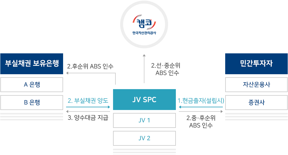 - 민간투자자 등이 출자하여 JV(합작투자 유동화전문유한회사) 또는 PEF(사모전문투자회사)를 설립한 후 매각대상채권을 JV에 확정가로 일괄 양도하여 JV가 발행하는 ABS 등을 공사 및 민간투자자가 인수하는 방식 - JV가 발행하는 선순위 ABS는 공사가 인수, 중순위·후순위는 출자지분에 따라 합작투자 참여자가 인수 |